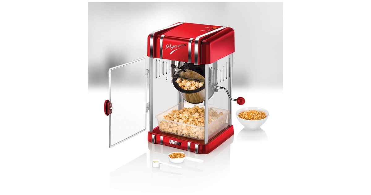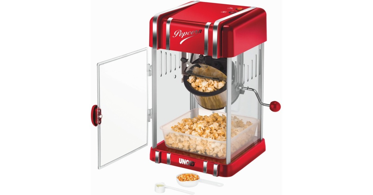 Für den gemütlichen Fernsehabend, den Kindergeburtstag oder die fröhliche Scrabble-Runde knuspriges Popcorn gefällig? Dann ist der Popcornmaker Retro von Unold im schicken Golden-Fifties-Look aus Rot-Metallic und Chrom ein Must-have! In den entnehmbaren, antihaftbeschichteten Edelstahltopf wird der Mais gefüllt, der mitgelieferte Messlöffel sorgt für die perfekte Menge. Die darauf punktgenau abgestimmte Ölmenge wird mit dem zweiten Messlöffel, der serienmäßig zur Ausstattung gehört, zugegeben. Dann auf „Betrieb“ drücken und los geht’s mit der Popcorn-Produktion. Die Knusperteile purzeln nach einer kurzen Aufheizphase dann in die entnehmbare Auffangschale. Mit dem Kippschalter „Beleuchtung/Warmhalten“ zeigt sich, wie schick ein Popcornmaker aussehen kann und er hält das Popcorn auf Genusstemperatur! Und gerade kleine Knabberfreunde schauen sicher begeistert zu, wenn der Mais sich fröhlich hüpfend zu Popcorn verwandel. Die mit Magnetverschluss ausgestattete Tür lässt sich einfach öffnen und seitliche Lüftungsschlitze sorgen für die ideale Luftzirkulation. Der Popcornmaker ist BPA-frei und mit Antirutsch-Füßen ausgestattet, die für einen sicheren Stand sorgen. Art.-Nr.: 1445929