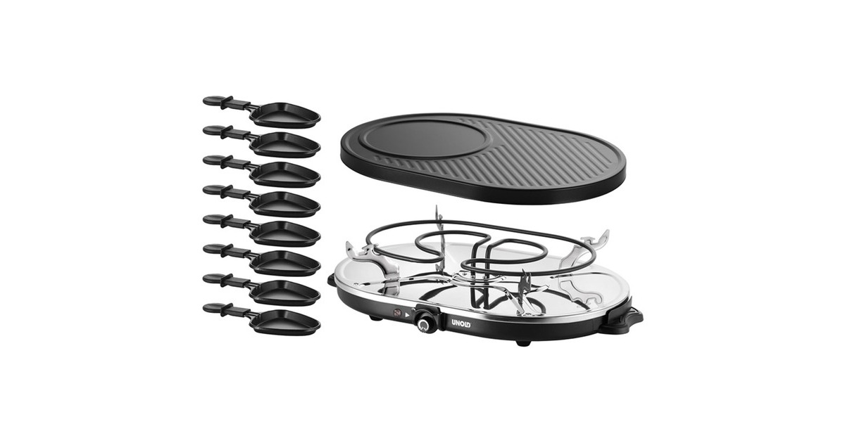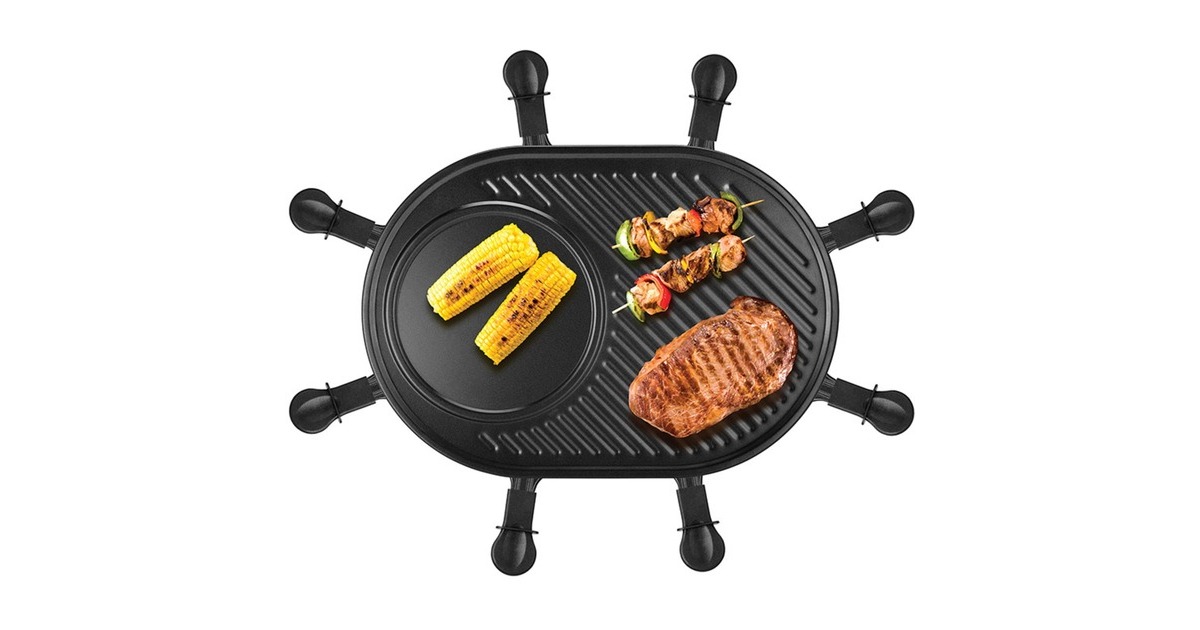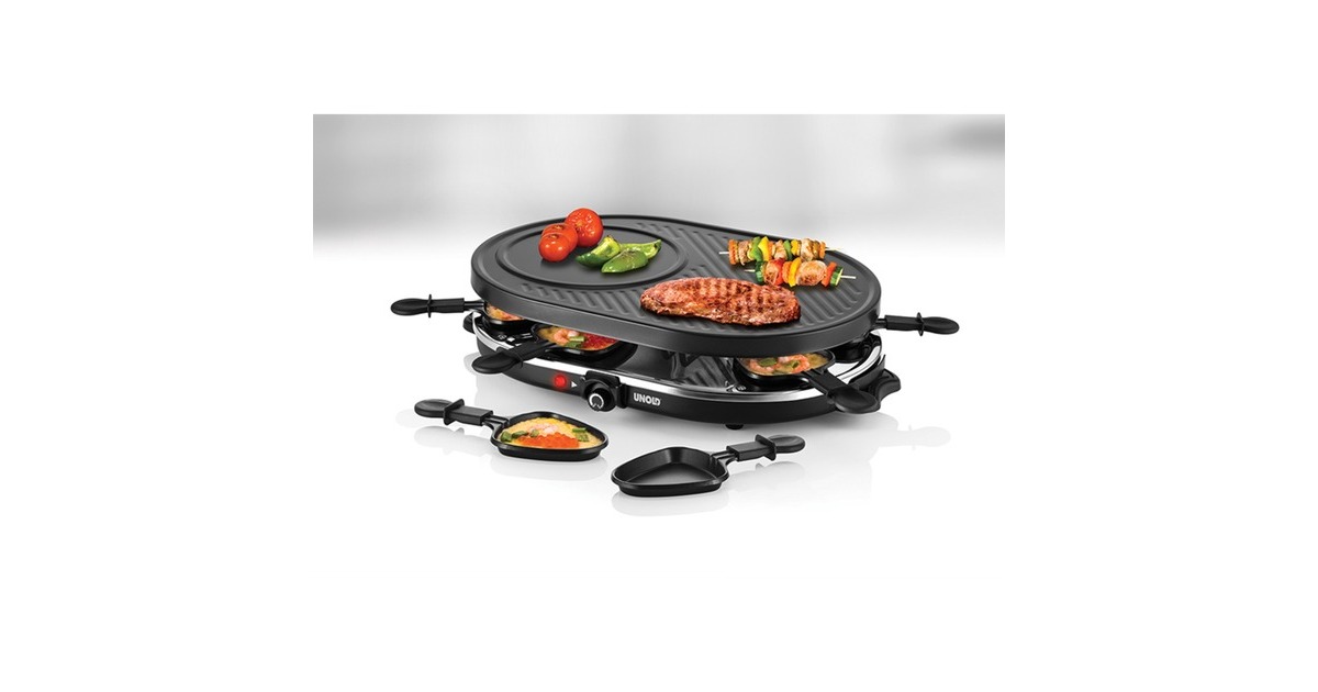Gemütliche Stunden am Esstisch, mittendrin das Raclette Gourmet, da kann ein gemütlicher Abend mit Familie und/ oder Freunden entspannt und genussvoll verbracht werden! In den acht antihaftbeschichteten Pfännchen brutzeln und gratinieren die leckeren, nach persönlichem Gusto komponierten Beilagen und auf der großzügigen Grillplatte werden derweil Fleisch oder Gemüsespieße, mariniertes Gemüse oder leckere Gambas zubereitet. Entschleunigt genießen! Die antihaftbeschichtete Grillplatte mit ihren glatten und geriffelten Grillflächen ist auf alle kulinarischen Anforderungen eingestellt. Die stufenlose Temperaturregelung sorgt dafür, dass alles perfekt gegrillt, gebraten und gegart wird! Ist alles parat, auf niedrigste Temperatur stellen, so bleiben die Köstlichkeiten immer auf Genusstemperatur! Durch die wärmeisolierten Griffe lassen sich die lecker befüllten Pfännchen gefahrlos entnehmen. Die Antirutschfüße sorgen dafür, dass das Raclette Gourmet sicher steht. Inspirierende Rezeptideen werden mit der Bedienungsanleitung frei Haus mitgeliefert.Art.-Nr.: 1632839
