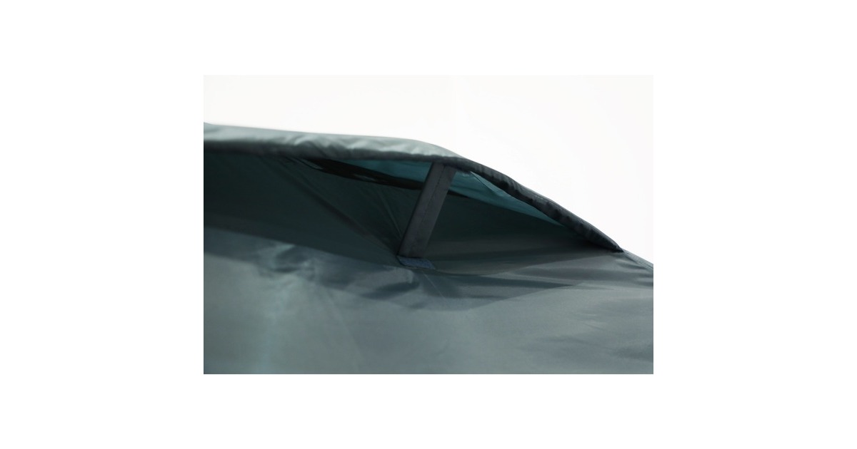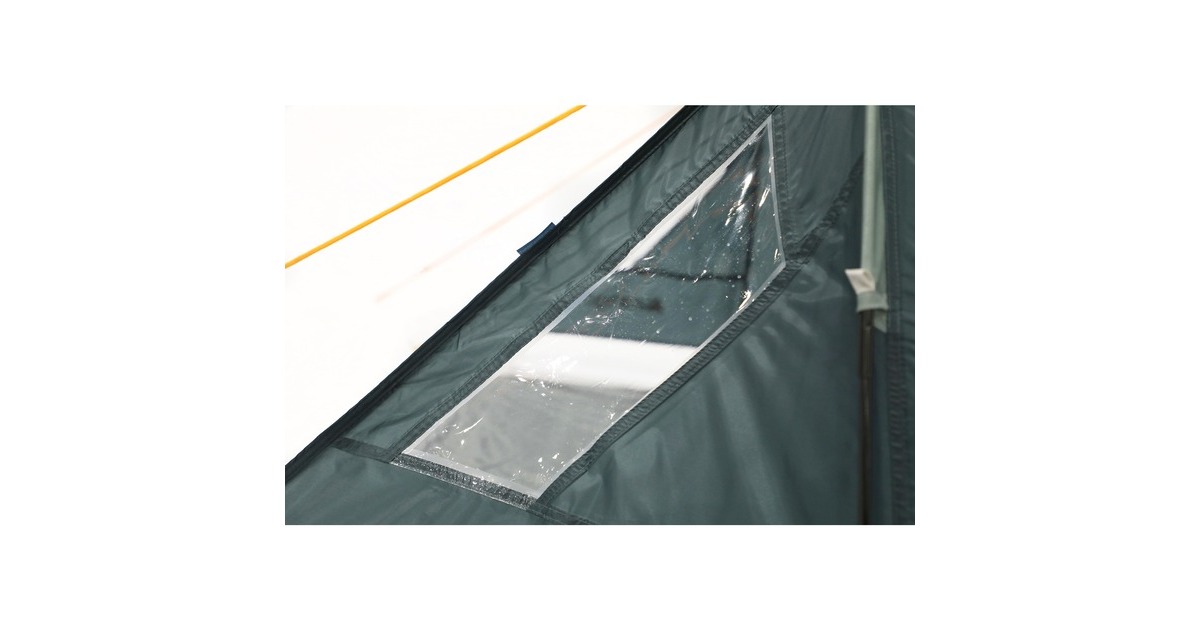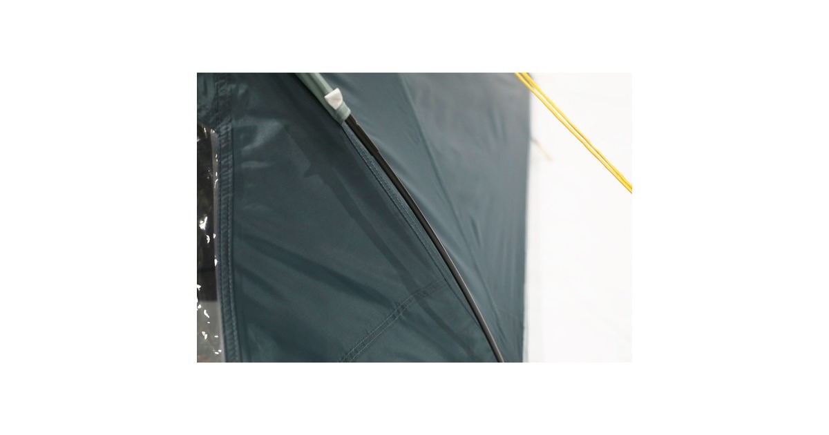 Aufbauzeit ca. 10 Minuten, Eingang (mit optionalen Aufstellstangen) als Sonnendach aufstellbar |