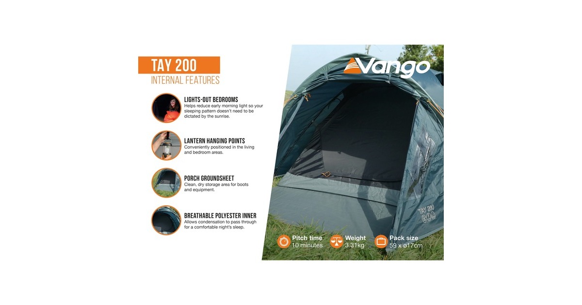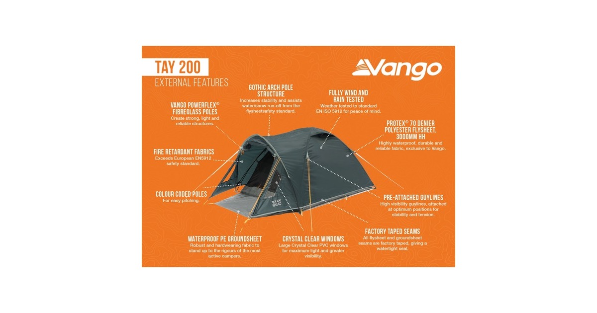 Das 2-Personen-Zelt Tay 200 in der Farbe "Deep Blue" von Vango bietet großartigen Platz im Innern bei kleiner Packgröße. Die gotisch geformten Gestängebögen bieten zusätzliche Stabilität und Kopffreiheit. Das Gestänge ist am Innenzelt angebracht, so ist es einfach aufgebaut und kann bei schönem Wetter auch ohne Außenzelt stehen. Die Vango PowerFlex Fiberglas Stangen sind stark, leicht und zuverlässig, das farblich markierte Gestänge erleichtert außerdem den Aufbau. Die abgedunkelte Lights-Out-Schlafkabine sorgt für einen erholsamen Schlaf ohne Störungen durch Tageslicht am frühen Morgen. Die günstig platzierten Taschen im Innenzelt bieten Stauraum für kleine Gegenstände, für die Campingausrüstung gibt es im Vorbau einen trockenen Stellplatz. Die großen Diamond Clear Fenster sorgen für viel Licht und gute Sicht im Vorbau. An der King-Pole-Eingangstür sind integrierte Ösen angebracht, um sie mit Aufstellstangen als Sonnendach verwenden zu können. Die flache, abnehmbare Bodenwanne hält den Vorraum sauber und trocken, zusätzlich wird die Bildung von Kondenswasser reduziert. Das Kuppelzelt Tay 200 ist die ideale Wahl z.B. für Erstcamper oder Festivalbesucher.Art.-Nr.: 100035197