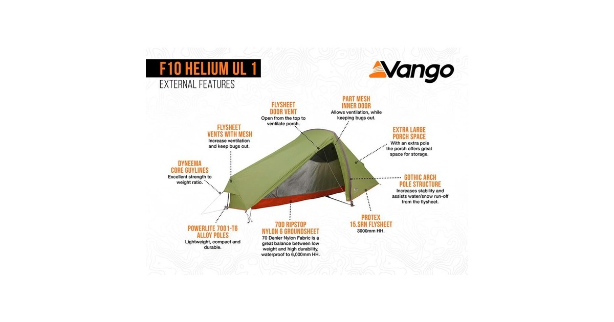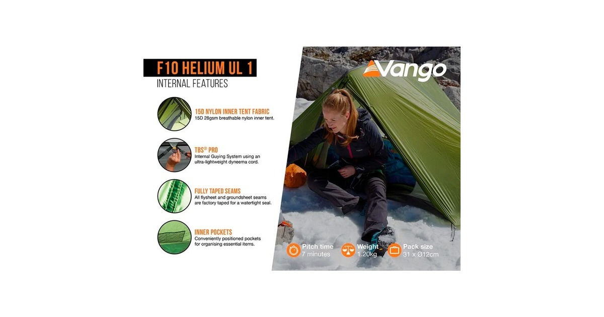 Das 1-Personen Ultralight-Zelt F10 Helium UL 1 in der Farbe "Alpine Green" aus der preisgekrönten Project Hydrogen Collection von Vango verfügt über ein Hybrid-Tunneldesign und lässt sich sehr schnell aufbauen. TBS Pro, das interne Abspannsystem mit ultraleichter Dyneema-Schnur und die abgewinkelten, gotisch geformten Stangen bieten außergewöhnliche Stabilität und wirksamen Schutz gegen Seitenwinde. Das Zelt verfügt über Belüftungsöffnungen, die einen Luftdurchfluss ermöglichen und so die Bildung von Kondenswasser reduzieren. Das Meshgewebe in der Tür zum Innenzelt sorgt für bessere Belüftung, ohne dass Insekten ins Zelt gelangen. Die günstig platzierten Taschen im Innenzelt bieten Stauraum für kleine Gegenstände, für die Campingausrüstung gibt es in der Apsis einen trockenen Stellplatz. Das F10 Helium UL 1 ist extrem leicht, mit kompaktem Packmaß und eignet sich ideal für Kurztrips, ohne Kompromisse bei Funktion oder Leistung.