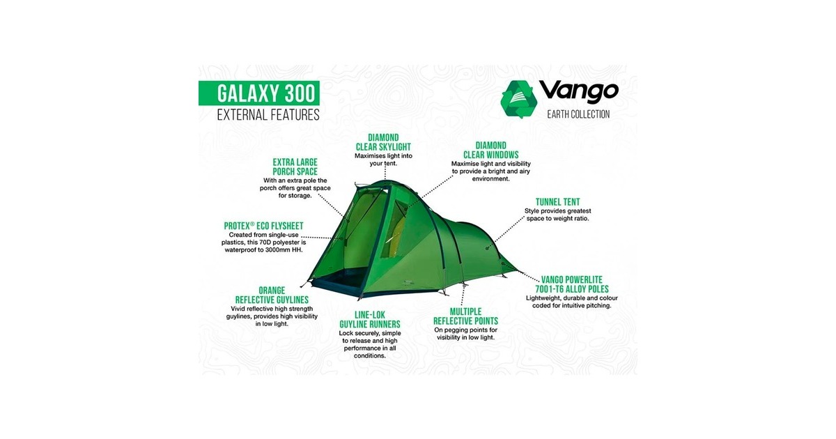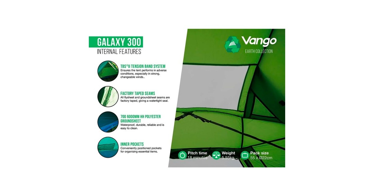 Das 3-Personen-Zelt Galaxy 300 in der Farbe "Pamir Green" von Vango ist die ideale Wahl für Camper, die nach einem Tunnelzelt mit extra großem Wohnbereich suchen, für Motorradtouren, Camping mit dem Auto oder in Gruppen für längere Trips, wo man den größeren Wohnraum zu schätzen weiß. Das Innen- und Außenzelt können gemeinsam aufgestellt werden, was den Auf- und Abbau wesentlich erleichtert. Das Vango PowerLite 7001-T6 Aluminium Gestänge ist leicht, kompakt und trotzdem flexibel und robust. Das farblich markierte Gestänge erleichtert den Aufbau zusätzlich. Die orangefarbenen, reflektierenden Abspannleinen mit Fixierungen sind gut sichtbar, reduzieren die Stolpergefahr und sorgen für Stabilität bei starken Winden. Die Tür der Schlafkabine hat einen O-förmigen Schnitt. So geht das Öffnen und Schließen mit einer Hand erheblich leichter. Das Meshgewebe sorgt für bessere Belüftung, ohne dass Insekten ins Zelt gelangen. Die günstig platzierten Taschen im Innenzelt bieten Stauraum für kleine Gegenstände, für die Campingausrüstung gibt es im Wohnbereich viel Stellplatz. Die großen Diamond Clear PVC-Fenster seitlich und im Dach sorgen für viel Licht und gute Sicht im Wohnbereich. Die abnehmbare Bodenwanne hält den Vorraum sauber und trocken, zusätzlich wird die Bildung von Kondenswasser reduziert. Das Galaxy 300 ist mit Vangos TBS II (Tension Band System) ausgestattet, welches das Zelt und das Gestänge bei extremem / richtungswechselndem Wind um das Vielfache stabiler macht.Art.-Nr.: 100035211
