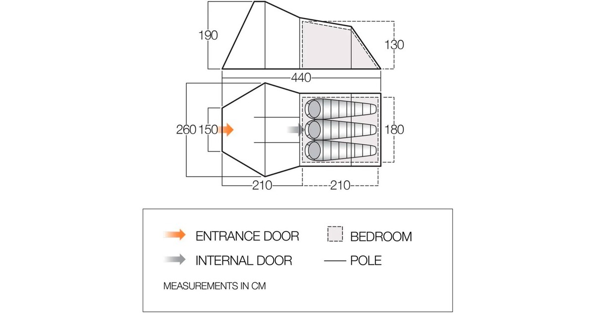 Lüftungsöffnungen im Dach, reflektierende Gestängelaschen, orangefarbene reflektierende Abspannleinen, 3 klare Fenster im Wohnraum |