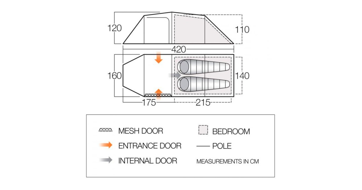 Das 2-Personen-Zelt Omega 250 von Vango ist die ideale Wahl für Camper, die nach einem Tunnelzelt mit zwei Seiteneingängen suchen, für Motorradtouren, Camping mit dem Auto oder in Gruppen für längere Trips, wo man den größeren Wohnraum zu schätzen weiß. Das Innen- und Außenzelt können gemeinsam aufgestellt werden, was den Auf- und Abbau wesentlich erleichtert. Das Vango PowerLite 7001-T6 Aluminium Gestänge ist leicht, kompakt und trotzdem flexibel und robust. Das farblich markierte Gestänge erleichtert den Aufbau zusätzlich. Die orangefarbenen, reflektierenden Abspannleinen mit Fixierungen sind gut sichtbar, reduzieren die Stolpergefahr und sorgen für Stabilität bei starken Winden. Die Tür der Schlafkabine hat einen O-förmigen Schnitt. So geht das Öffnen und Schließen mit einer Hand erheblich leichter. Das Meshgewebe sorgt für bessere Belüftung, ohne dass Insekten ins Zelt gelangen. Die günstig platzierten Taschen im Innenzelt bieten Stauraum für kleine Gegenstände, für die Campingausrüstung gibt es im Wohnbereich viel Stellplatz. Die großen Diamond Clear PVC-Fenster sorgt für viel Licht und gute Sicht. Die abnehmbare Bodenwanne hält den Vorraum sauber und trocken, zusätzlich wird die Bildung von Kondenswasser reduziert. Das extra große Sonnensegel spendet Schatten und bietet bei schlechten Wetterbedingungen Schutz vor Regen. Es ist auch ideal, um Schuhe o.ä. vor dem Zelt stehen zu lassen, ohne dass sie in der Nacht feucht werden. Das Omega 250 ist mit Vangos TBS II (Tension Band System) ausgestattet, welches das Zelt und das Gestänge bei extremem / richtungswechselndem Wind um das Vielfache stabiler macht.Art.-Nr.: 1893106