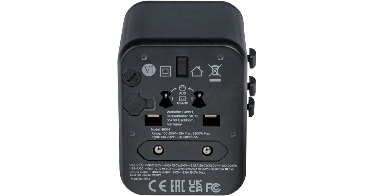 1x USB-A (Buchse), 1x USB-C (Buchse), Typ A (USA, Kanada, Mexiko & Japan), Typ B (USA, Kanada, Mexiko & Japan), Typ C (Europa, Südamerika & Asien), Typ E (Frankreich, Belgien, Polen, Slowakei & Tschechien), Typ F (Europa & Russland), Typ G (Großbritannien, Irland, Malta, Malaysia & Singapur), Typ I (Australien, Neuseeland, China & Argentinien), Typ J (Schweiz, Liechtenstein & Ruanda), Typ L (Italien & Chile), Typ N (Brasilien) |