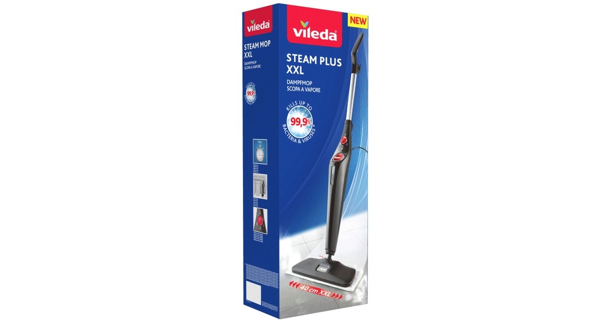 Der Steam Plus XXL Dampfreiniger von Vileda sorgt für die hygienische und gründliche Reinigung von versiegelten Hartböden. Dank seiner extra großen Bodenplatte (40cm) eignet er sich ideal für große Haushalte. Er entfernt bis zu 99,9% aller Bakterien ohne die Verwendung von chemischen Reinigern. Für besondere Hygieneanforderungen reicht die herkömmliche feuchte Reinigung mit einem Wischmop oder Flachwischer oft nicht aus. Dafür sind chemische Reiniger für Eltern mit Kindern, Haustierbesitzer oder Allergiker aber oft keine Option. Der Vileda Steam XXL Dampfreiniger schafft beides, perfekte Sauberkeit ganz ohne chemische Reiniger. Bei der Fußbodenreinigung mit dem Vileda Steam XXL werden 99,9% der Bakterien nur mit reinem, heißem Wasserdampf entfernt. Das schont den Boden, den Geldbeutel und die Gesundheit. Dank des neuen ergonomischen Griffs überzeugt der Vileda Steam Plus XXL darüber hinaus durch seine einfache Handhabung und sein innovatives, ansprechendes Design. Mit einer einzigen Tankfüllung kann man bis zu 130m² Fläche reinigen. Dank des 7 Meter langen Kabels ist auch in großen Räumen eine ausreichende Reichweite gegeben. Dank seines geringen Gewichts lässt sich der Steam sehr einfach handhaben, das schont den Rücken und spart Kraft. Der hochwertige Mikrofaserbezug erledigt die gründliche und streifenfreie Reinigung, und der dreieckige Fuß kommt dabei problemlos in alle Ecken. Für die Teppichreinigung verfügt der Steam Plus XXL Dampfreiniger über einen Teppichgleiter, der auch für Polstermöbel und Matratzen verwendet werden kann. Dabei funktioniert das System unkompliziert, man füllt lediglich Wasser in den Tank des Dampfreinigers und verschließt ihn mit dem Stutzen. Dann schließt man das Gerät an die Steckdose an und schaltet es ein. Nach nur 15 Sekunden ist der Dampfreiniger einsatzbereit.Art.-Nr.: 100046560