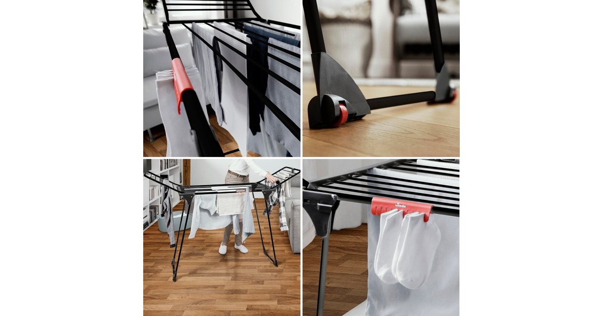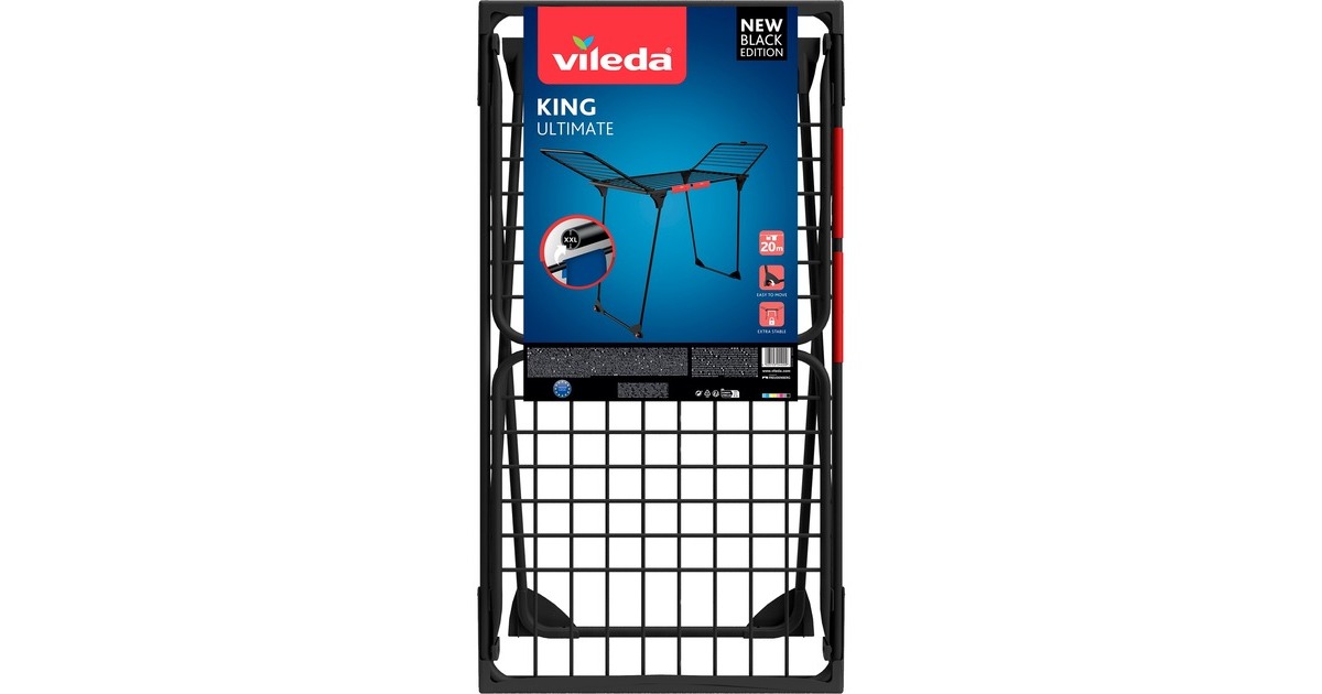 Der Vileda KING Ultimate Wäscheständer bietet eine schnelle und effektive Möglichkeit, um Wäsche zu trocknen. Mit extra dicken XXL-Leinen können bis zu zwei Waschmaschinenfüllungen faltenfrei aufgehängt werden. Dank paralleler Standbeine und extra langer Gelenke steht der Wäscheständer stabil und sicher. Für kleine Wäschestücke wie Socken oder Unterwäsche gibt es praktische Kleinteilehalterungen. Der Wäscheständer ist in mattem Schwarz gehalten und besteht aus beschichtetem Stahl und Aluminium. Kratzschutz und Rollen erleichtern den Transport, während eine Transportsicherung für platzsparendes Verstauen sorgt.