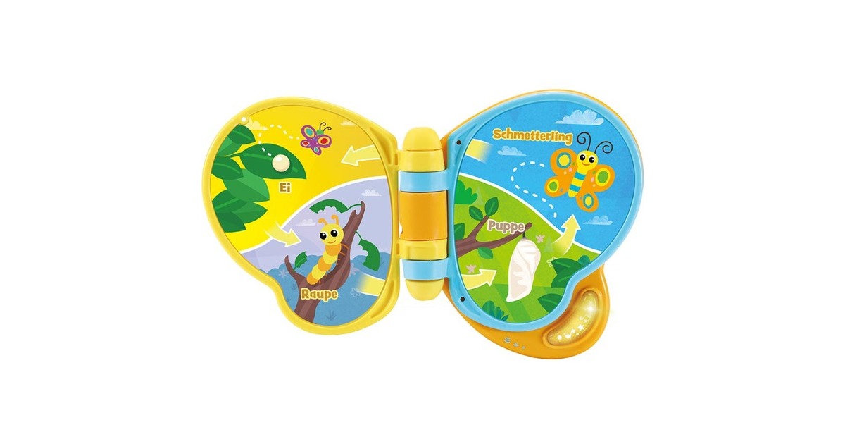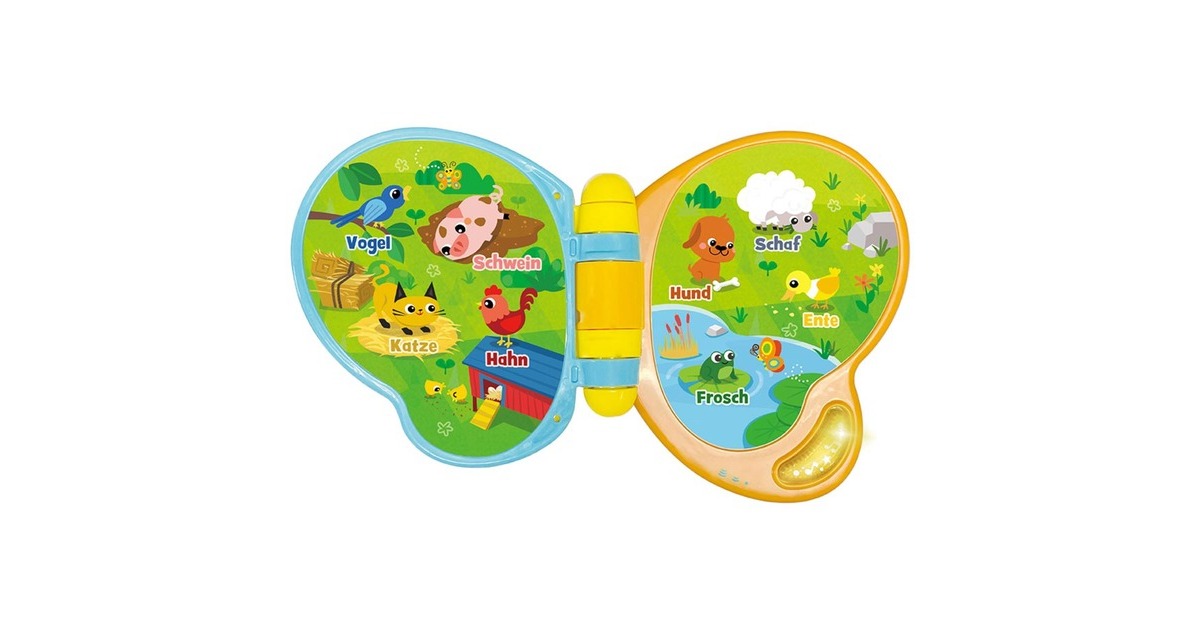 Der 2-in-1-Schmetterling ist nicht nur ein süßer bunter Schmetterling mit interaktiven Funktionen, seine Flügel sind außerdem abnehmbar und verwandeln sich in ein Buch mit leuchtender Taste, in dem es tolle Dinge über Bauernhoftiere zu erfahren gibt. Wird der Schmetterling gezogen, wackelt er und seine Fühler bewegen sich. Zusätzlich werden lustige Geräusche und Musik ausgelöst. Das vierseitige Buch lädt zum Entdecken von Tiergeräuschen ein und zeigt die Entwicklung eines Schmetterlings.Art.-Nr.: 1764286
