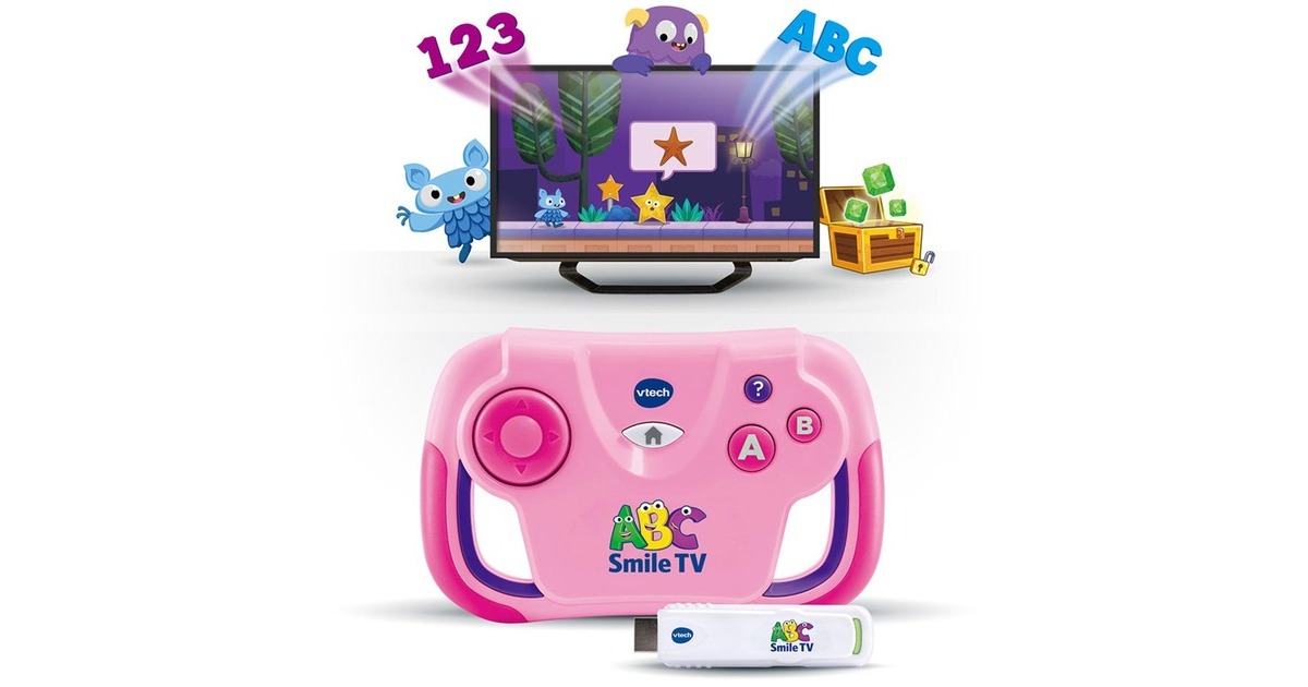 Bereit für ein spaßiges Lernabenteuer? Mit ABC Smile TV gehen Kinder ab 3 Jahren auf Entdeckungsreise. Die Schlüssel des Schlaubeerschlosses wurden von Kobolden gestohlen. Nun gilt es, die Welten Buchstabenland, Zahlingen, Farbhausen und Formenstadt im Schlaubeerkönigreich zu bereisen und dabei Zahlen, Buchstaben, Formen und Farben kennenzulernen. Dabei treffen die kleinen Entdecker immer wieder auf liebevoll gestaltete Figuren. Diese TV-Lernkonsole, die aus einem Controller und einem an einen Fernseher anzuschließenden HDMI-Stick besteht, bietet damit stundenlangen Spielspaß voller Überraschungen und spannender Lerninhalte. Art.-Nr.: 1764204