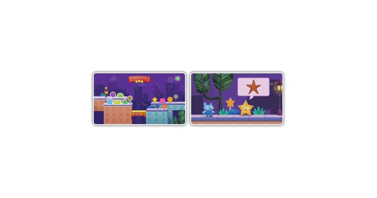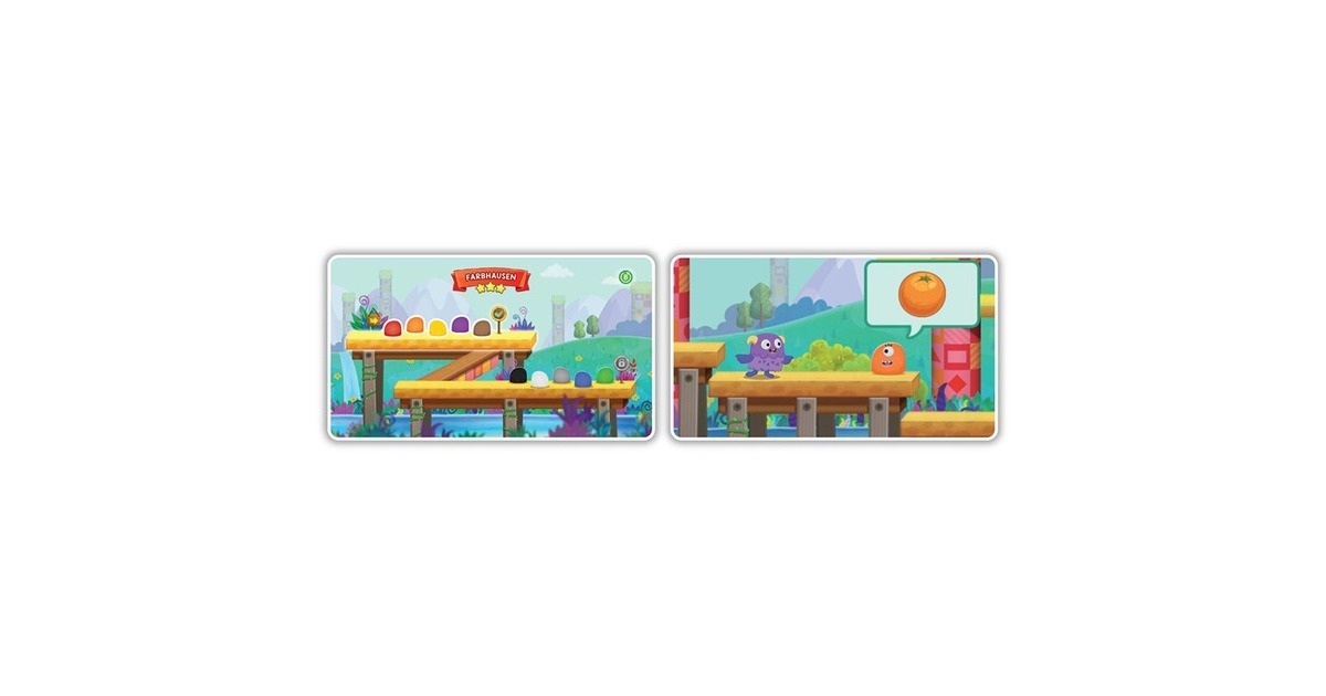 Controller und HDMI-Stick zum Anschluss an einen Fernseher, HDMI-Stick unterstützt Plug and Play, der Controller arbeitet schnurlos. Zwei niedliche Monster-Avatare führen durch die magische Welt des Schlaubeer-Königreichs und können mithilfe der Pfeiltasten manövriert werden. Spannende Spiele zu den Themen Buchstaben, Buchstabenlaute, Anfangsbuchstaben, Wörter, Zahlen, Formen und Farben, Belohnungen in Form von Schlaubeeren und Schlüsseln, mit denen verschiedene neue Bereiche geöffnet werden können. 15 Spiel-Level, 150 Lernelemente, bis zu 5 Spielerprofile können angelegt werden. Framerate: 25 fps. |