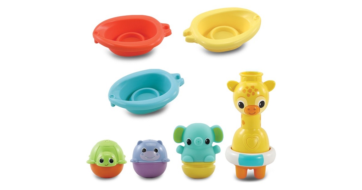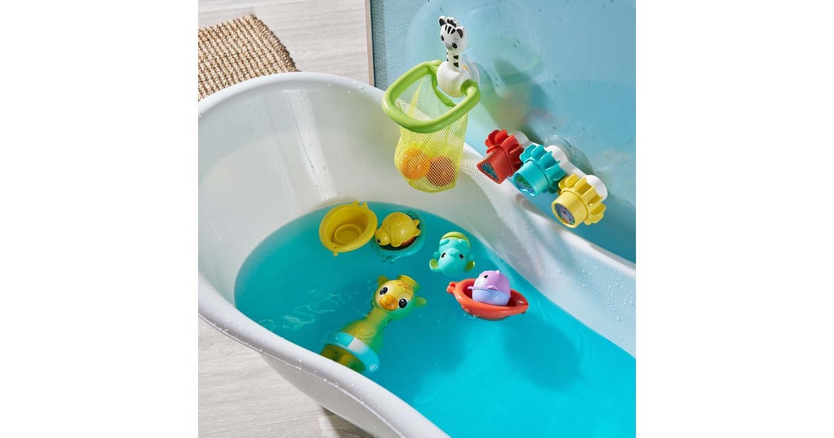 Ein tolles Set für jede Menge Spaß in der Badewanne. Viele verschiedene Teile bringen dabei jede Menge Abwechslung: Wird Wasser in die Giraffe gegossen, so wird der Schwimmring zu einem kleinen Springbrunnen. Wird der kleine Elefant mit Wasser gefüllt und gedrückt, so spritzt Wasser aus seinem Rüssel. Mit den 3 Tier-Tassen kann nach Herzenslust geschöpft und gegossen werden. Die Formenklötzchen zum Aufstecken und die Zahlenräder schulen die Feinmotorik. Mit dabei ist auch ein Netz, das per Saugnapf an der Wannenwand befestigt werden kann. Drei Bälle können ins Netz geworfen werden, zusätzlich kann es als Aufbewahrungsmöglichkeit dienen.Art.-Nr.: 100004672