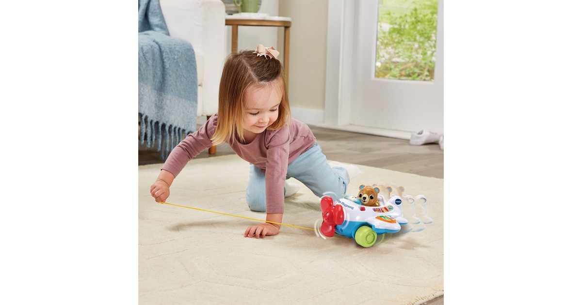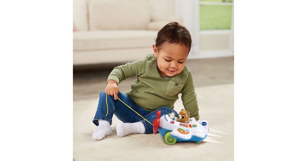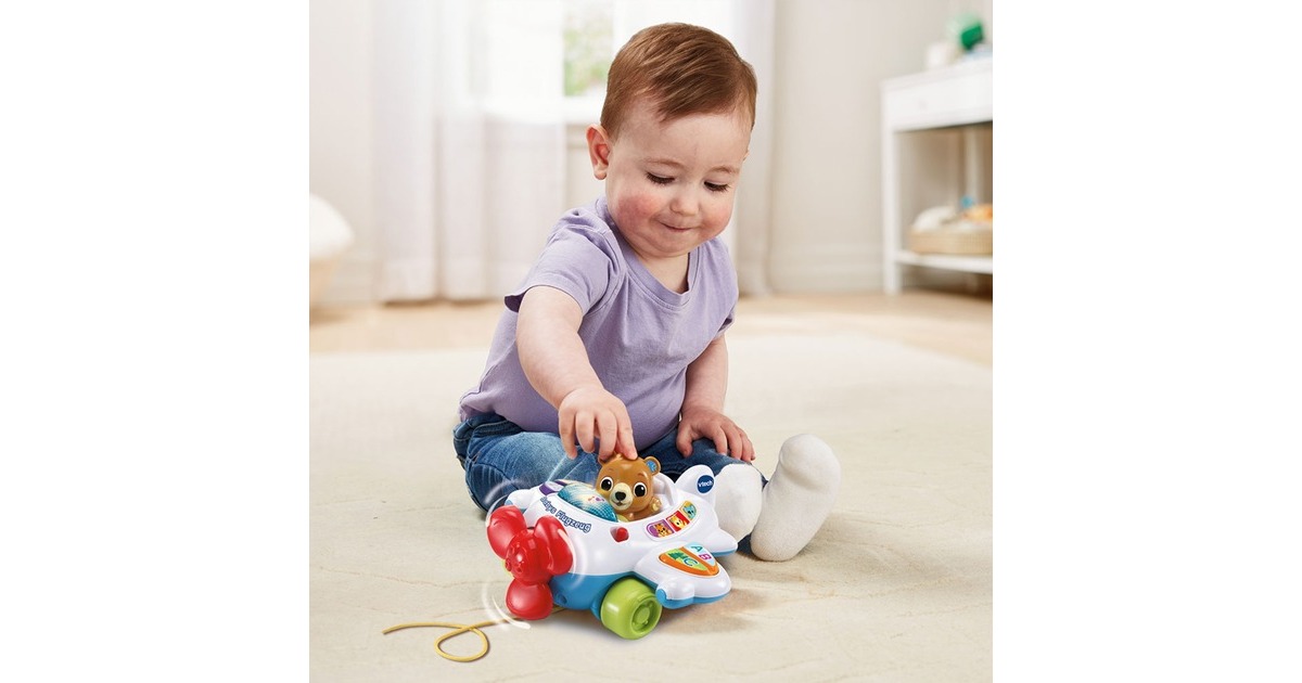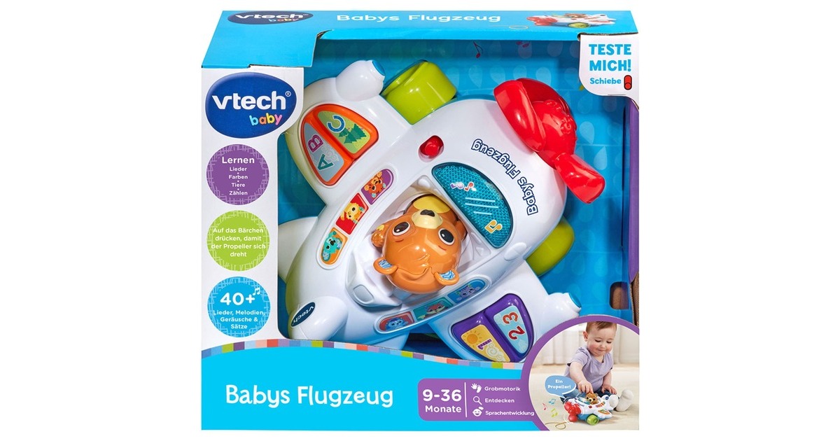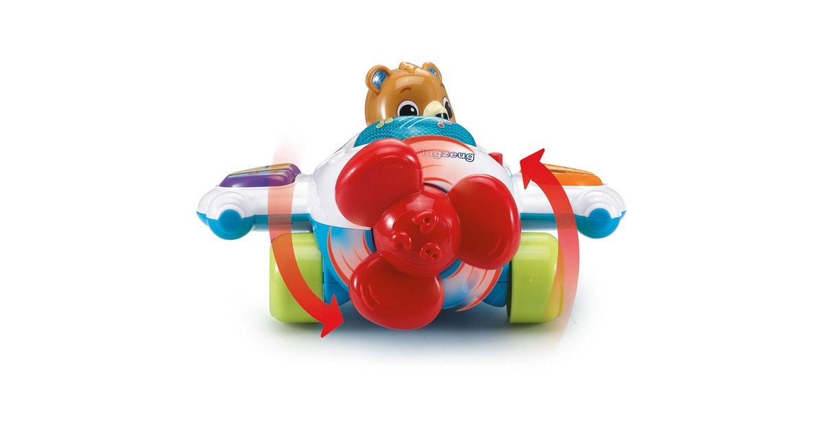Mit dem süßen Flugzeug mit Bär von VTech können Babys spannende Abenteuer erleben. Durch Drücken der Musiktaste am Cockpit werden Melodien, Sätze, Geräusche und Lieder ausgelöst. Drückt man auf die Bärenschnauze, dreht sich der Propeller und weitere Sätze erklingen. Die violette Taste löst Sätze zu den Buchstaben A bis C aus und die blaue Taste zählt die Teile des Flugzeugs von 1 bis 3. Zusätzlich erkennt ein Bewegungssensor, wenn das Flugzeug gezogen oder geschoben wird und löst entsprechende Sätze und Geräusche aus.Art.-Nr.: 100037679
