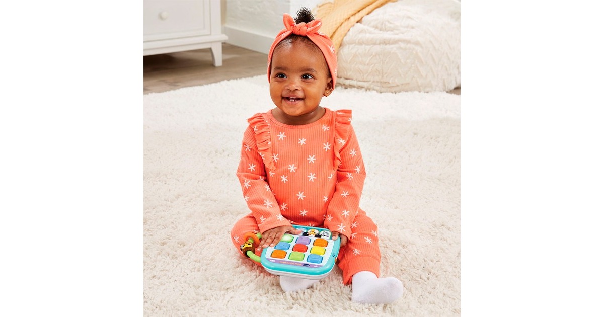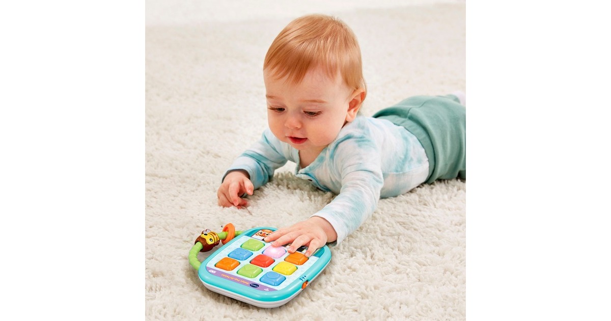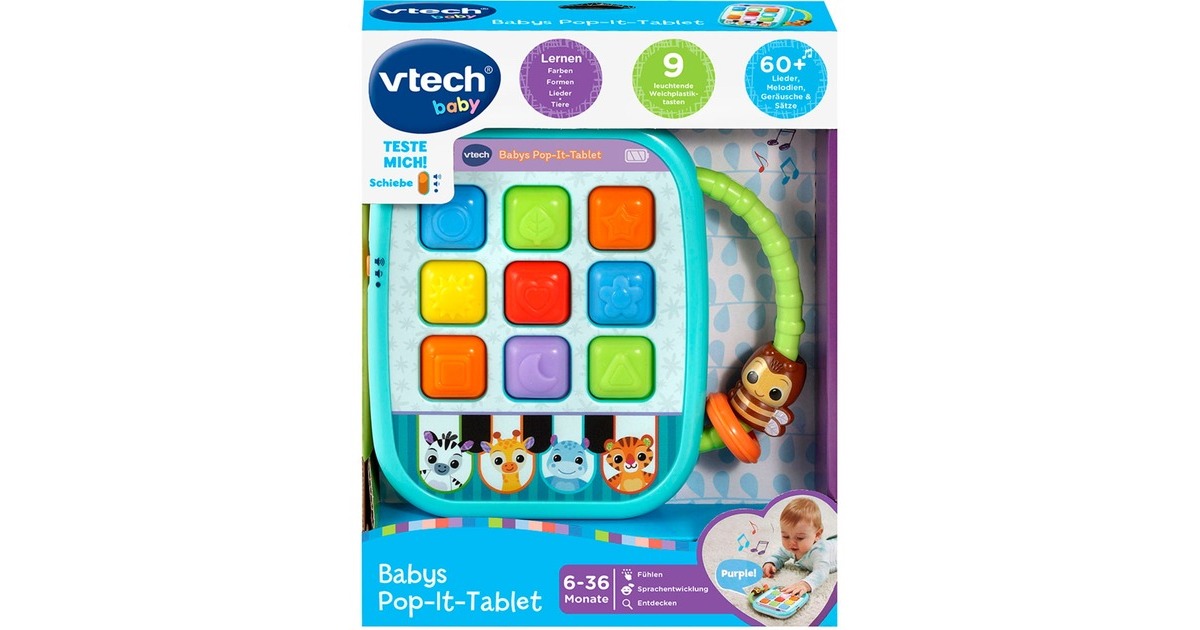 Babys Pop-It-Tablet verspricht musikalischen Spielspaß und schult nebenbei die Sinne von Kindern ab einem Alter von 6 Monaten. Formen und Farben werden hier spielerisch erlernt. Die neun Tasten aus Weichplastik leuchten und blinken zu Melodien und Musik. Außerdem haben sie verschiedene Reliefmuster und stimulieren so die taktile und visuelle Wahrnehmung.Art.-Nr.: 1895992