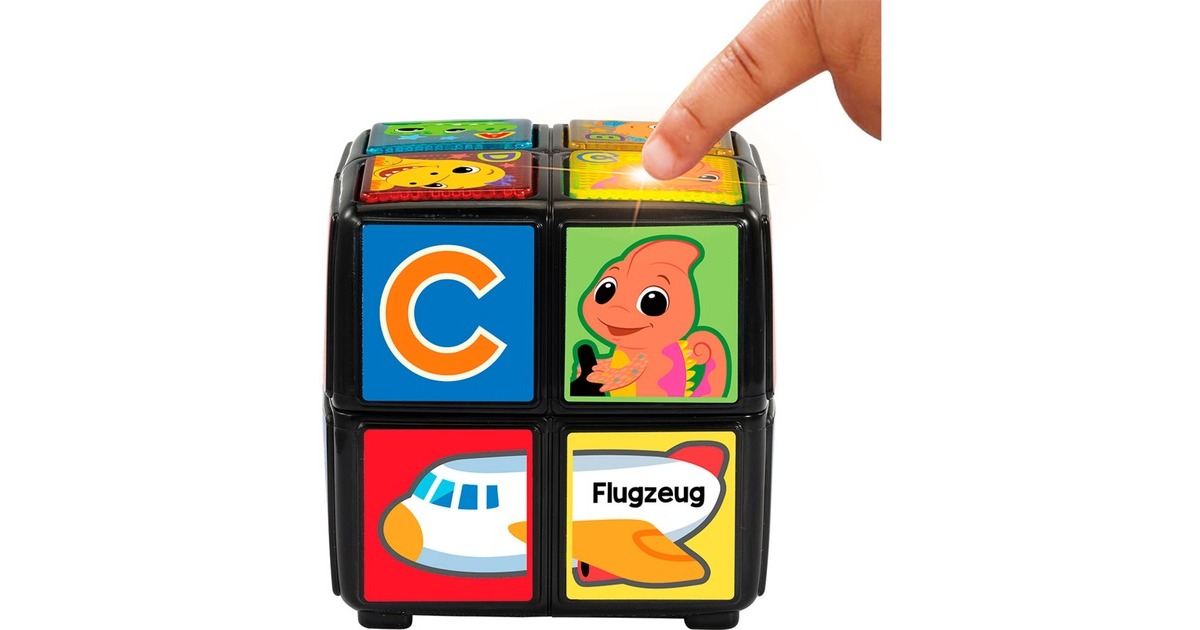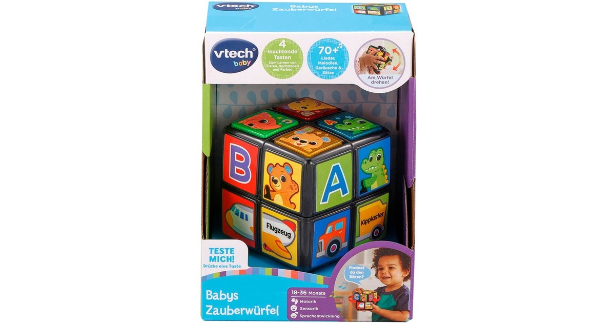 Drehen und lernen mit Babys Zauberwürfel! Dieser leuchtende Würfel bringt den Kleinsten ab 18 Monaten einfache Sätze bei. Wird der Würfel, sind viele verschiedene Kombinationen an Tierfreunden und Fahrzeugen möglich. Damit fördert er die motorischen Fähigkeiten, die Hand-Auge-Koordination und das logische Verständnis.Art.-Nr.: 1895996