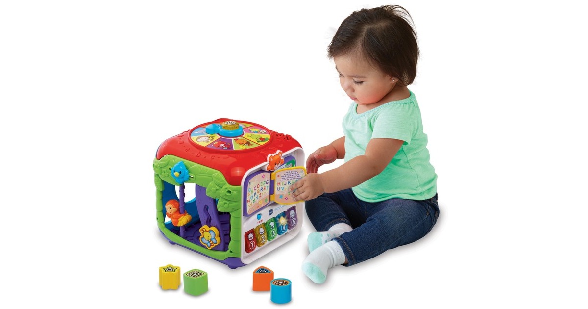 Spiel- und Lernspaß auf 5 Seiten! Spielwürfel zur Förderung der motorischen Fähigkeiten. 5 aufleuchtende Klaviertasten benennen Zahlen, Tiere und lösen Tiergeräusche sowie Musik aus. Zeiger zum Drehen benennt das jeweilige Tier, Buch mit Seite zum Umklappen spielt Lieder, Bärchen-Taste löst Melodien aus, viele bewegliche Elemente zum Schieben, Drücken und Drehen, 4 bunte Formen zum Einwerfen, 4 gesungene Lieder, 10 Kindermelodien (Liedtexte in der Bedienungsanleitung), Lautstärkeregler, Kindersicheres Batteriefach und Abschaltautomatik.Art.-Nr.: 1260235