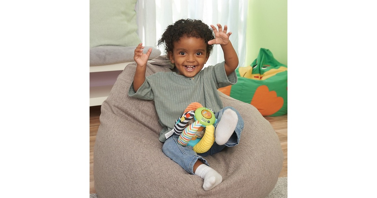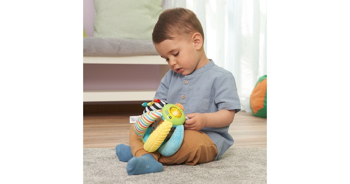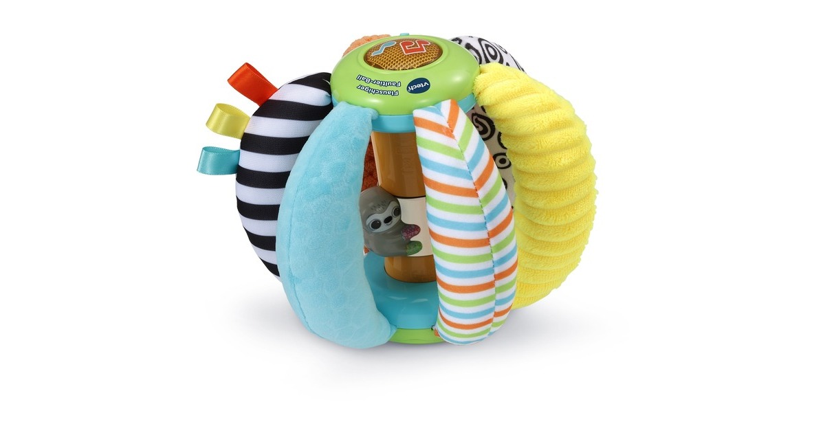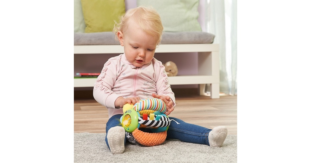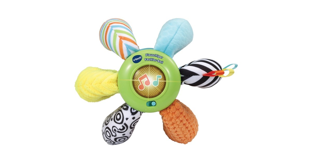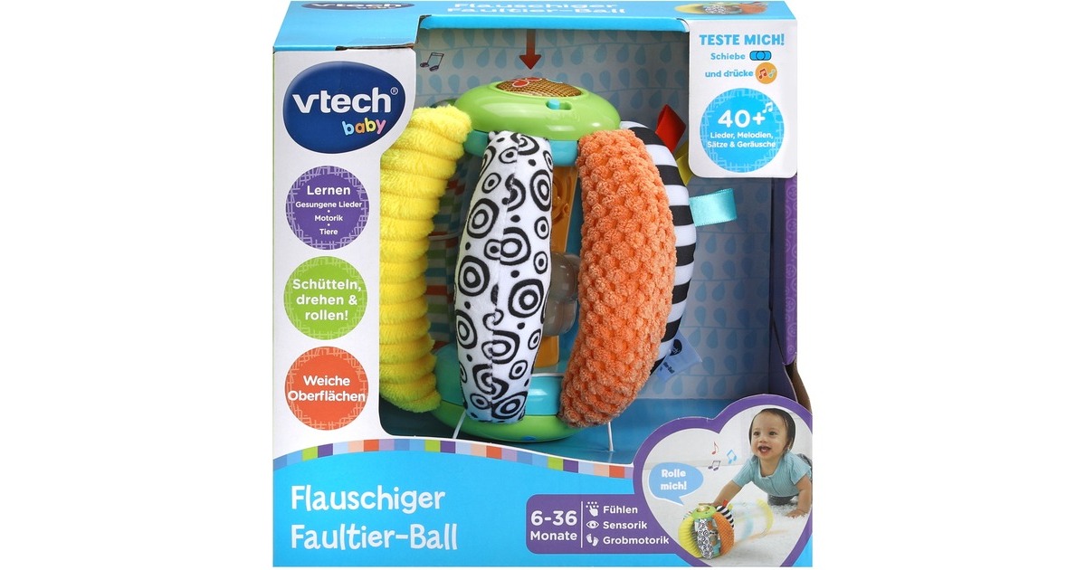 Dieses flauschige Spielzeug von VTech ist ein echtes Erlebnis für alle Sinne: Es besteht aus verschiedenen Materialien und hat 6 weiche Tragegriffe, in deren Mitte ein süßes Faultier sitzt. So lässt sich das Spielzeug auch für kleine Hände gut greifen und die unterschiedlichen Oberflächen regen den Tastsinn an. Die Leuchttaste löst lustige Sätze, Lieder und Melodien aus. Wird der Ball gerollt, so erzeugt der integrierte Bewegungssensor ebenfalls lustige Geräusche.Art.-Nr.: 100004639