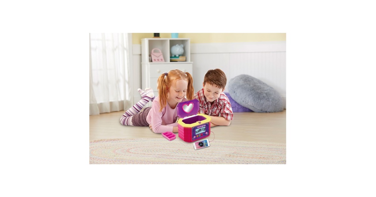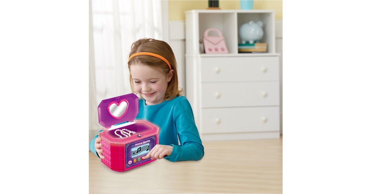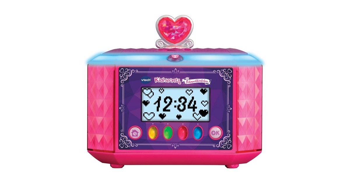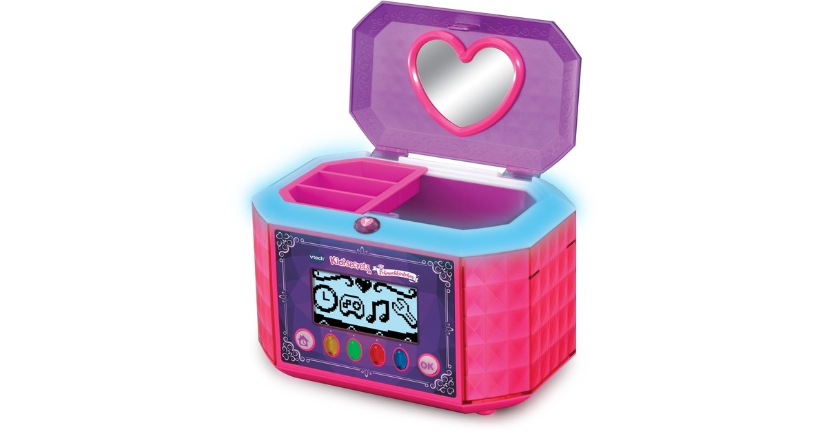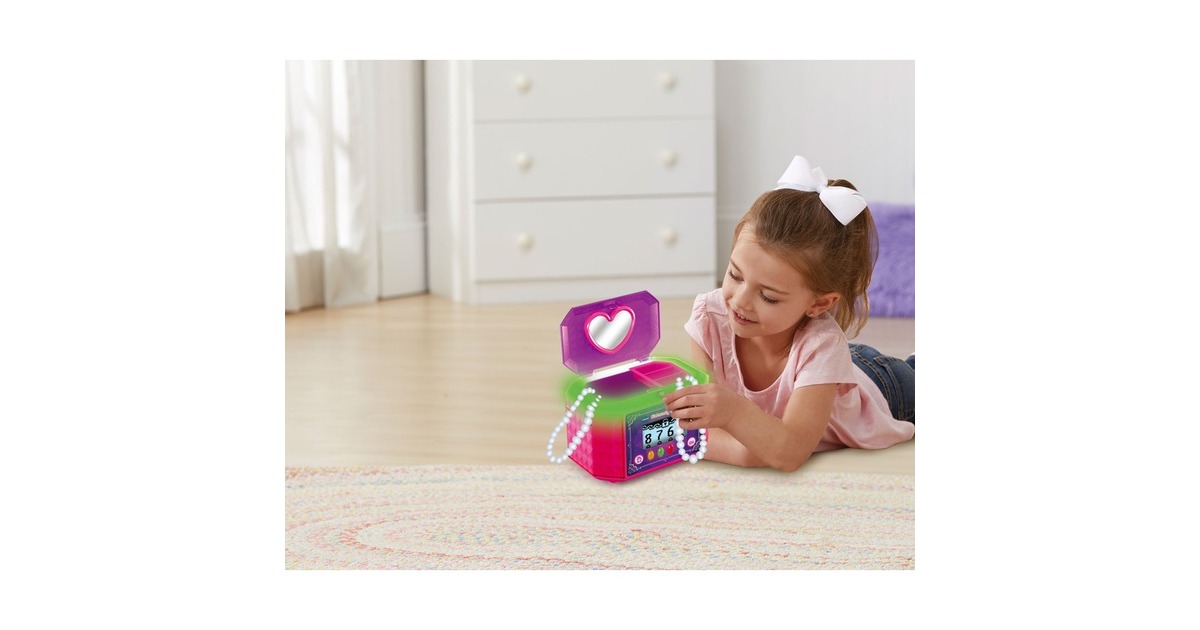 In dem 6-in-1 Schmuckkästchen alle Geheimnisse sicher aufbewahren! In dem Schmuckkästchen können alle Schätze mit einem Zahlencode geschützt werden. Durch Eingabe des Zahlencodes öffnet es sich automatisch und wird dabei magisch erleuchtet. Mit Weckfunktion und Leuchteffekten. In verschiedenen Farben leuchtendes Lichtband am Deckel des Kästchens. Die funkelnden Lichteffekte variieren je nach Aktivität. Es kann ein externer Musikplayer angeschlossen werden, um die eigenen Lieblingslieder zu hören. Mit interaktivem LCD-Bildschirm. 10 Spiele, 4 Musikaktivitäten. Herausnehmbares Fach und Stauraum. Integrierter Spiegel am Deckel der Truhe.Art.-Nr.: 1626007