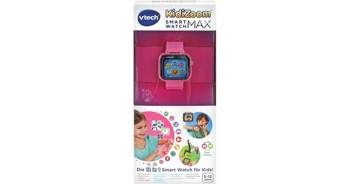 Die Vtech KidiZoom Smart Watch MAX ist eine Smartwatch für Kinder mit extra großem Display für maximalen Spaß. Durch die Duokamera kann man überall coole Fotos, Videos und Selfies machen. Die KidiZoom Smart Watch MAX bietet Apps wie die Melodien-Box, Reaktionsspiele und Puzzles, Erinnerungen oder z.B. einen Schulalarm. Mit ca. 40 Ziffernblätter kann man die Uhr immer auf sein Outfit abstimmen und über den QR-Code auf der Packung stets ein neues Monster des Tages entdecken. Die KidiZoom Smart Watch MAX ist spritzwasserfest und hat einen Elternkontrollbereich, wodurch z.B. Spiele deaktiviert werden können.Art.-Nr.: 100004781