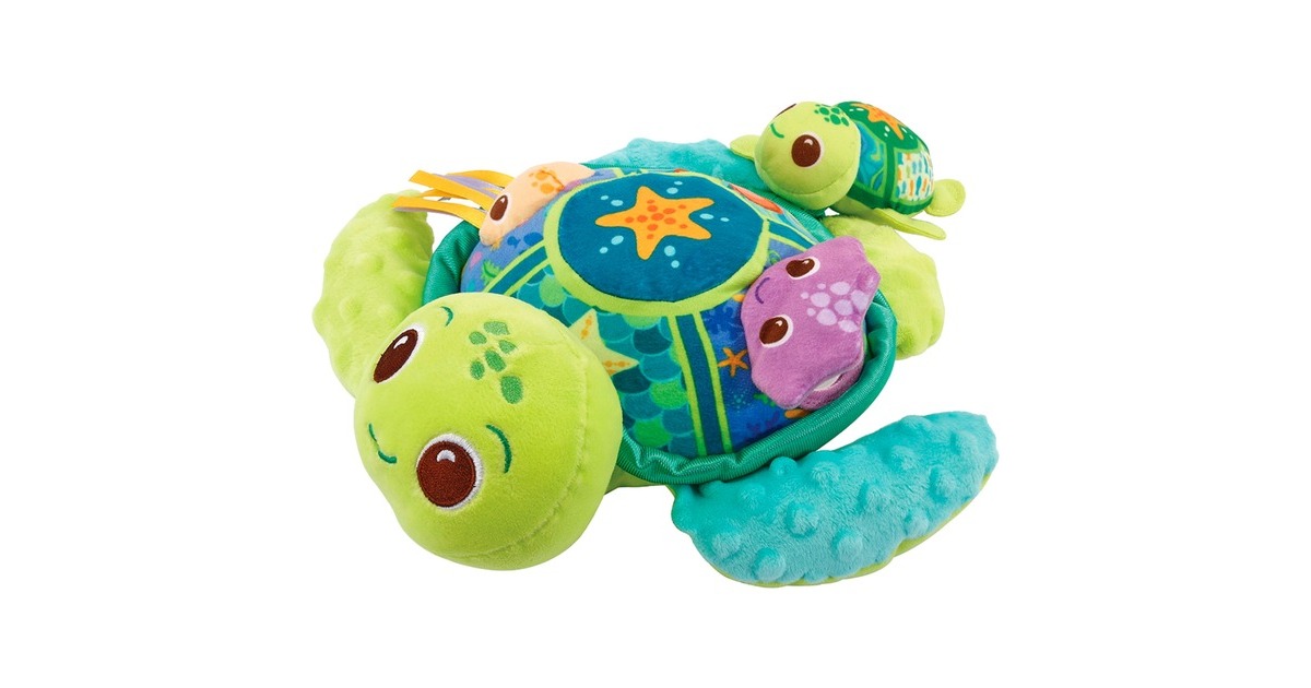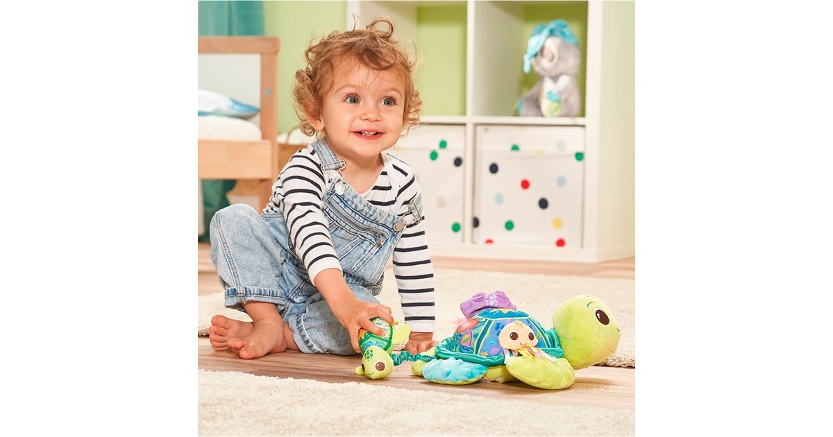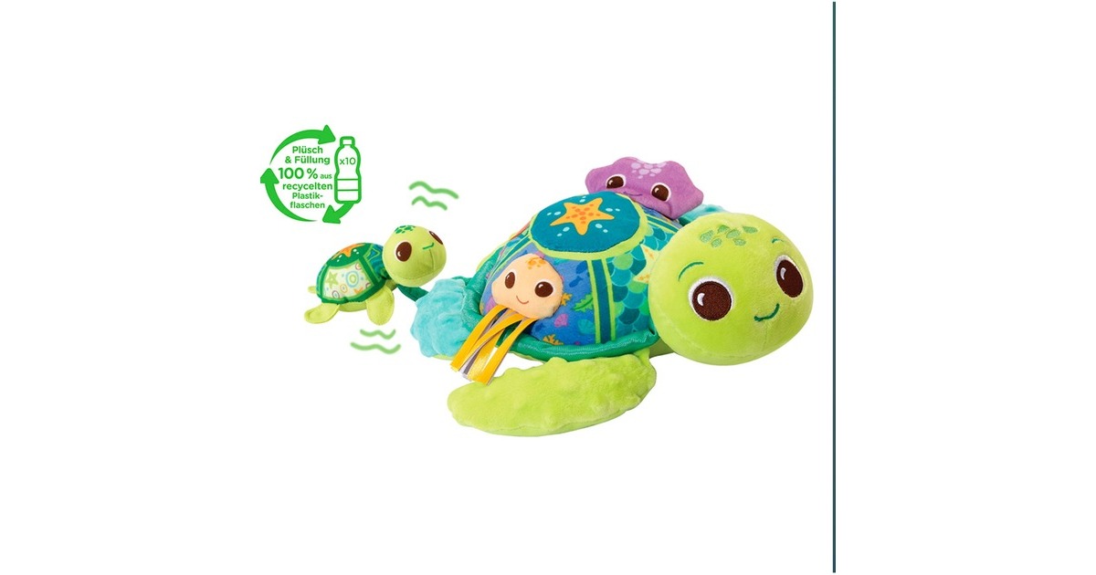 Mit der VTech Mama Meeresschildkröte auf Tuchfühlung gehen! Zahlreiche Spielemente regen den Tastsinn an und fördern die sensorische Wahrnehmung. Kleine Meeresforscher können zum Beispiel einen Muschelspiegel zum Aufklappen, eine Qualle mit Bändern und verschiedene Reliefmuster entdecken. Die verschiedenen Stoffarten und Oberflächenstrukturen runden das Erlebnis ab. Drei Tasten am Schildkrötenpanzer lösen niedliche Sätze, Geräusche und Musik aus. Die kleine Schildkröte lässt sich an einer Schnur herausziehen und bewegt sich dank des Aufziehmechanismus wieder auf die große Schildkröte zu. Das Plüschtier ist zudem nachhaltig produziert: Der Stoff wurde zu 100 % auf Basis von recycelten Plastikflaschen hergestellt.Art.-Nr.: 100004640