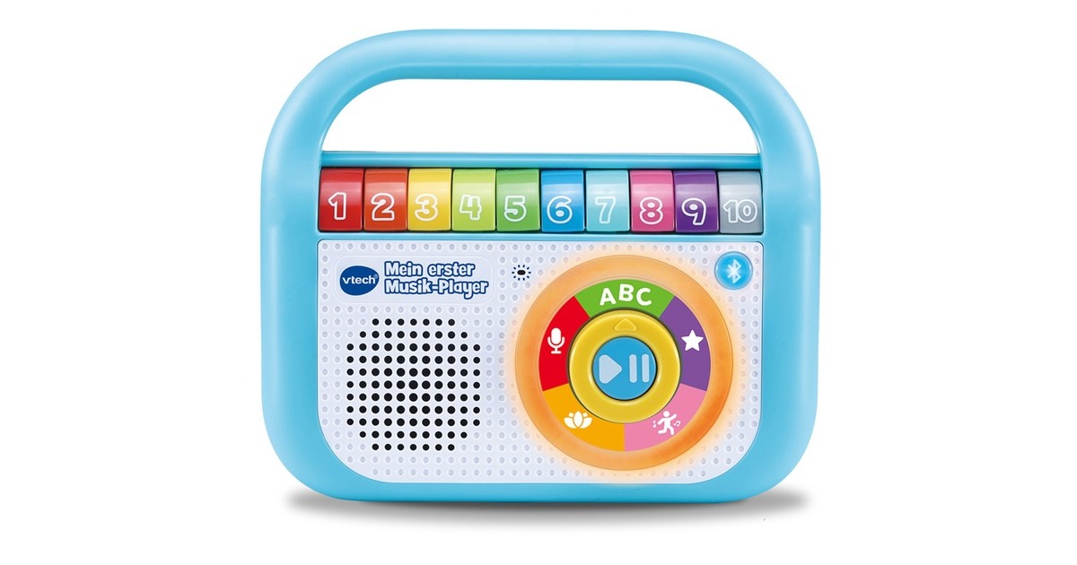 Mein erster Musik-Player kommt mit Bluetooth- und Aufnahmefunktion, kann überall mitgenommen werden und fördert die musikalische Entiwicklung. Dieses Spielzeug enthält 40 Lieder in 4 Kategorien, Lernlieder, bekannte Kinderlieder, Lieder zum Tanzen, Entspannungs- und Schlaflieder - insgesamt über eine Stunde Musik, die über die Zahlentasten und den Ringschalter abgerufen wird. Zusätzlich lässt sich per Bluetooth eigene Musik abspielen, eine Kopfhörer-Buchse ist ebenfalls vorhanden (Kopfhörer sind separat erhältlich). Der LED-Ring leuchtet passend zur abgespielten Musik.Art.-Nr.: 1847058