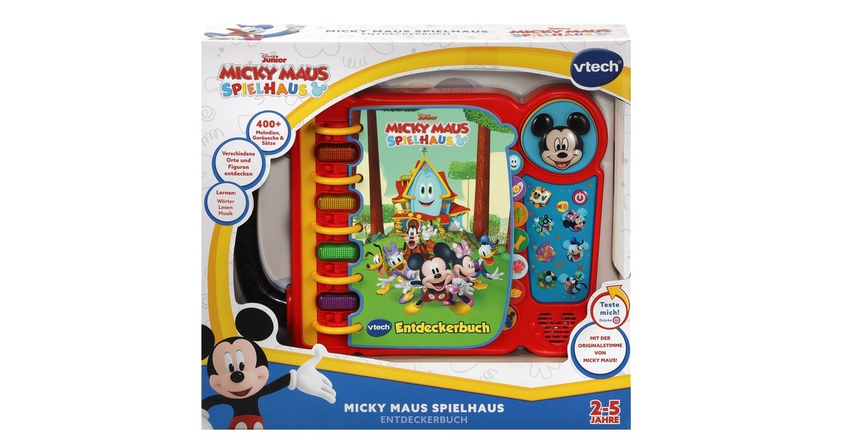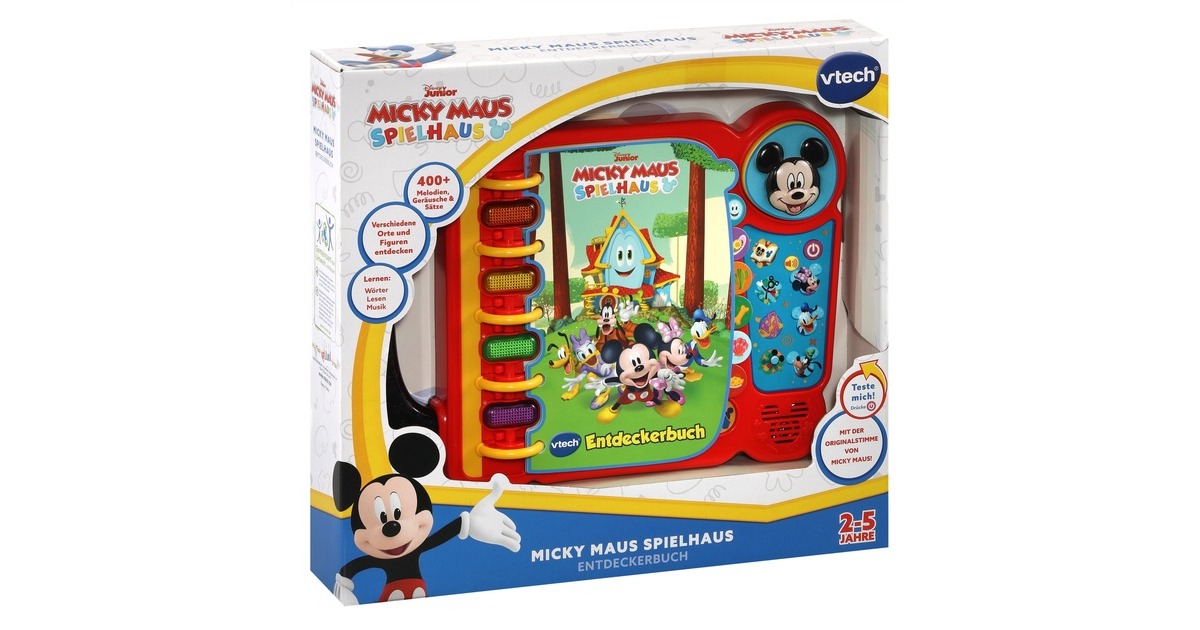 Auf 14 Seiten können Kinder ab zwei Jahren mit diesem Entdeckerbuch spannende Abenteuer mit Micky Maus und seinen Freunden erleben. DIe Geschichten im Buch passen zur TV-Serie Micky Maus Spielhaus und drehen sich um Gegenstände oder Personen aus der Serie, Musik und Wörter. Das Buch hat vier leuchtende Tasten, die gesprochene Sätze und Geräuscheffekte auslösen. Hinzu kommen 3 Figurentasten zu Minnie, Goofy und Donald. Art.-Nr.: 1847119