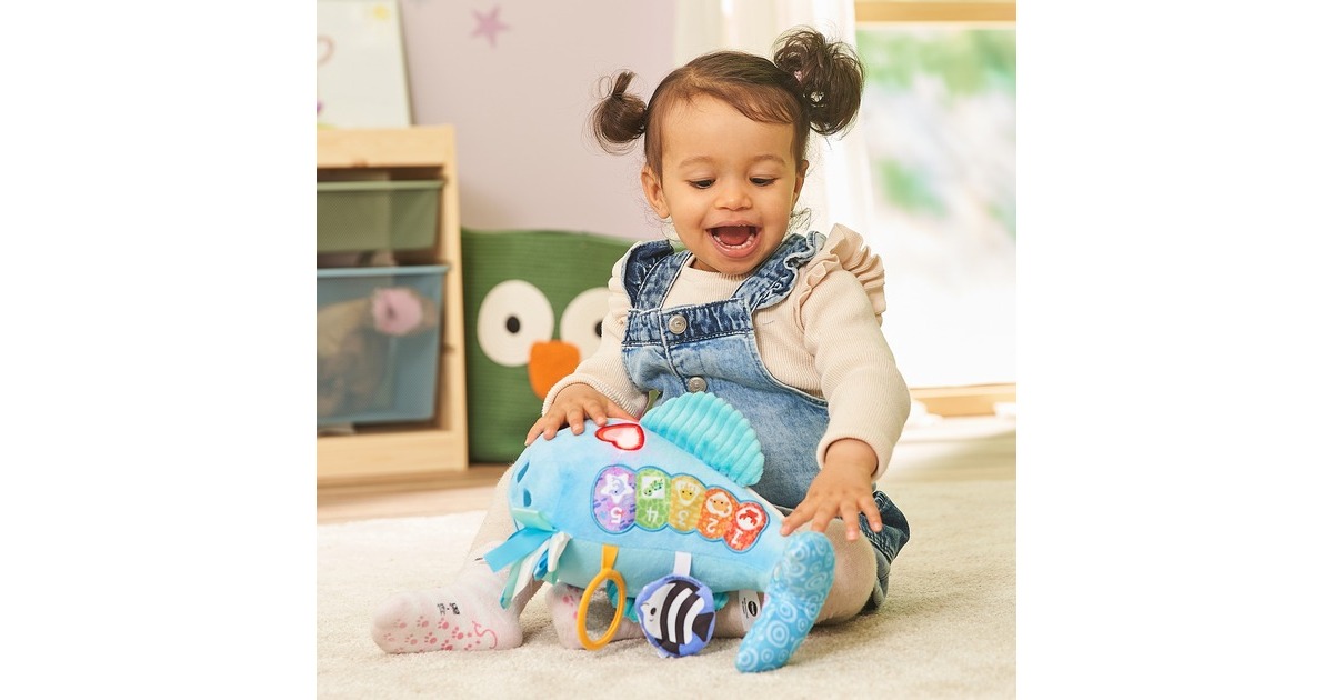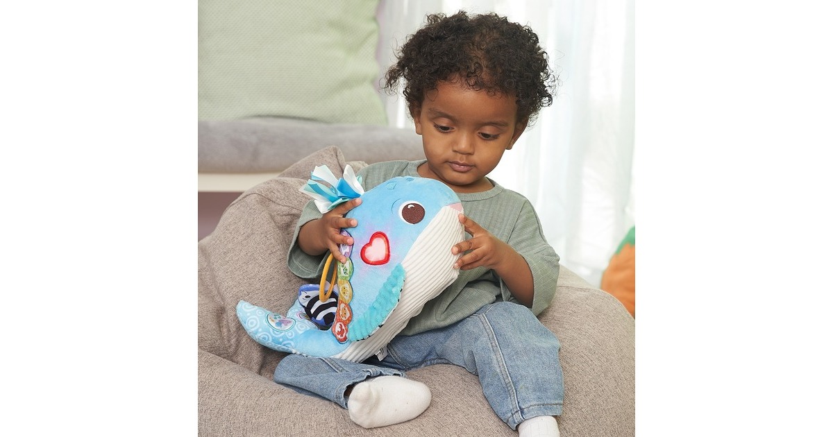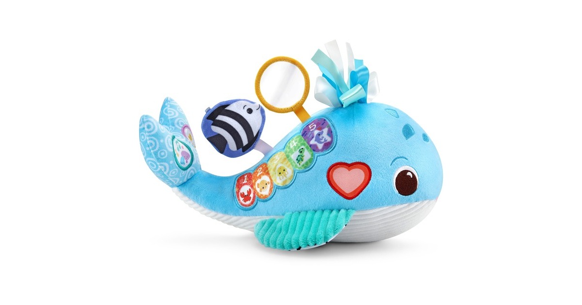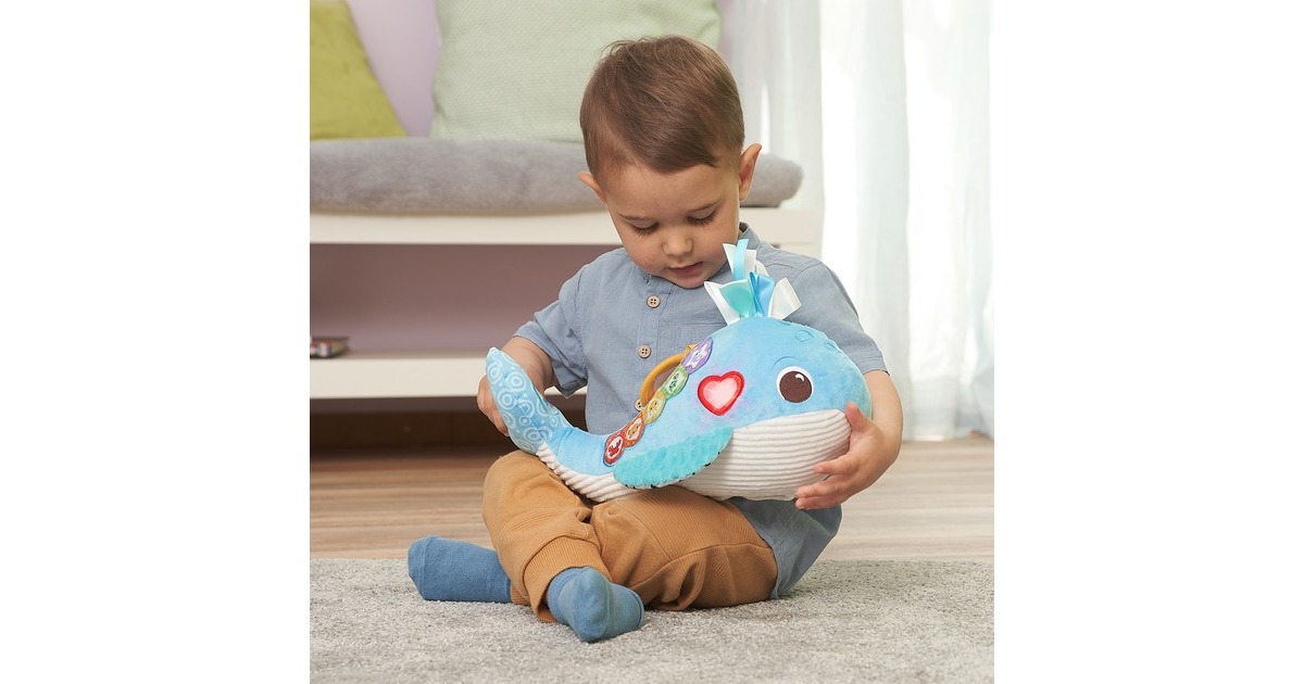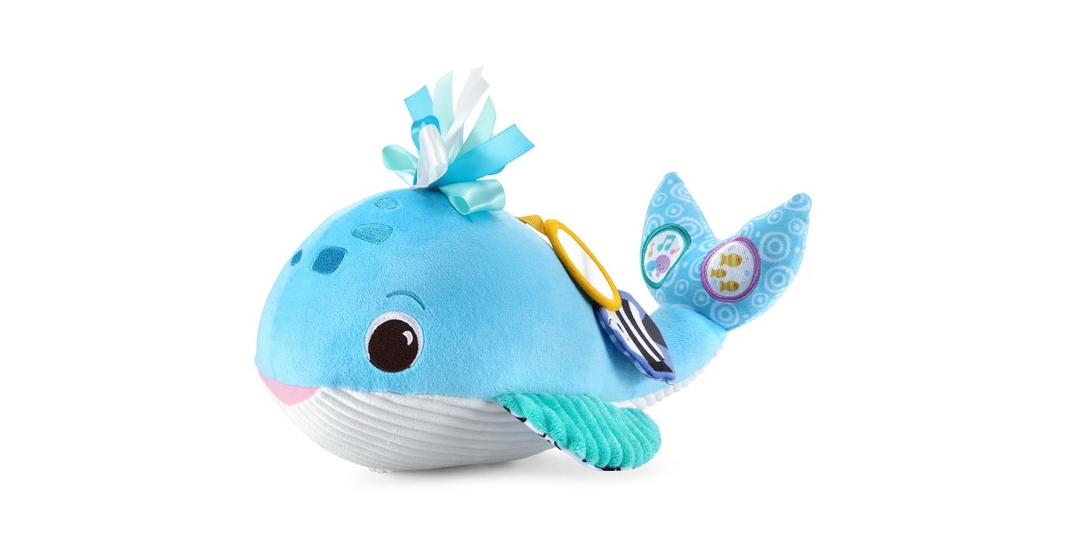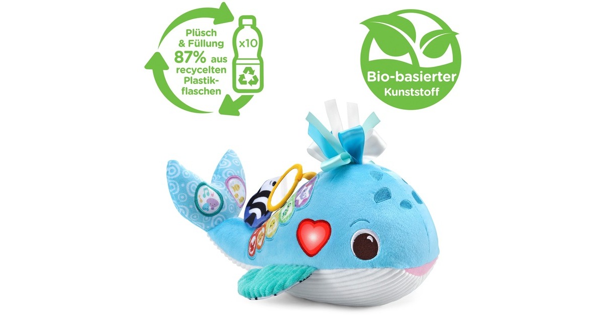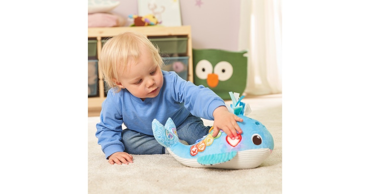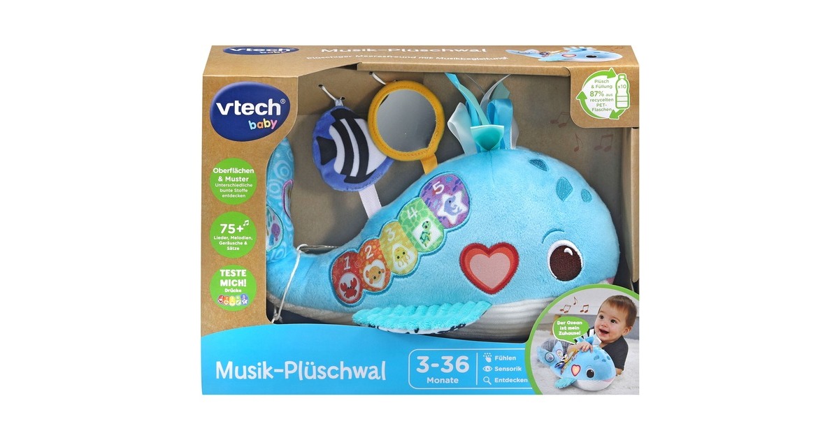Der Musik-Plüschwal von VTech ist ein kuschelweicher, musikalischer Gefährte für Kinder ab 3 Monaten: Mit verschiedenen Greifelementen und Oberflächen regt er den Tastsinn an. 5 regenbogenfarbene Klaviertasten spielen Geräusche und Lerninhalte zu Zahlen, Farben, Formen und Meerestieren ab. Die Herztaste leuchtet und löst verschiedene Sätze aus, zwei Tasten an der Schwanzflosse erzeugen Musik und Naturgeräusche. Die Flossen des Wals sind auch für kleine Hände leicht zu greifen und knistern. Zum Entdecken gibt es als Anhänger einen kleinen Fisch und einen Spiegel.