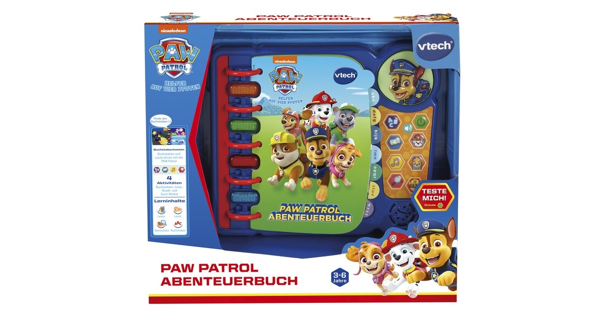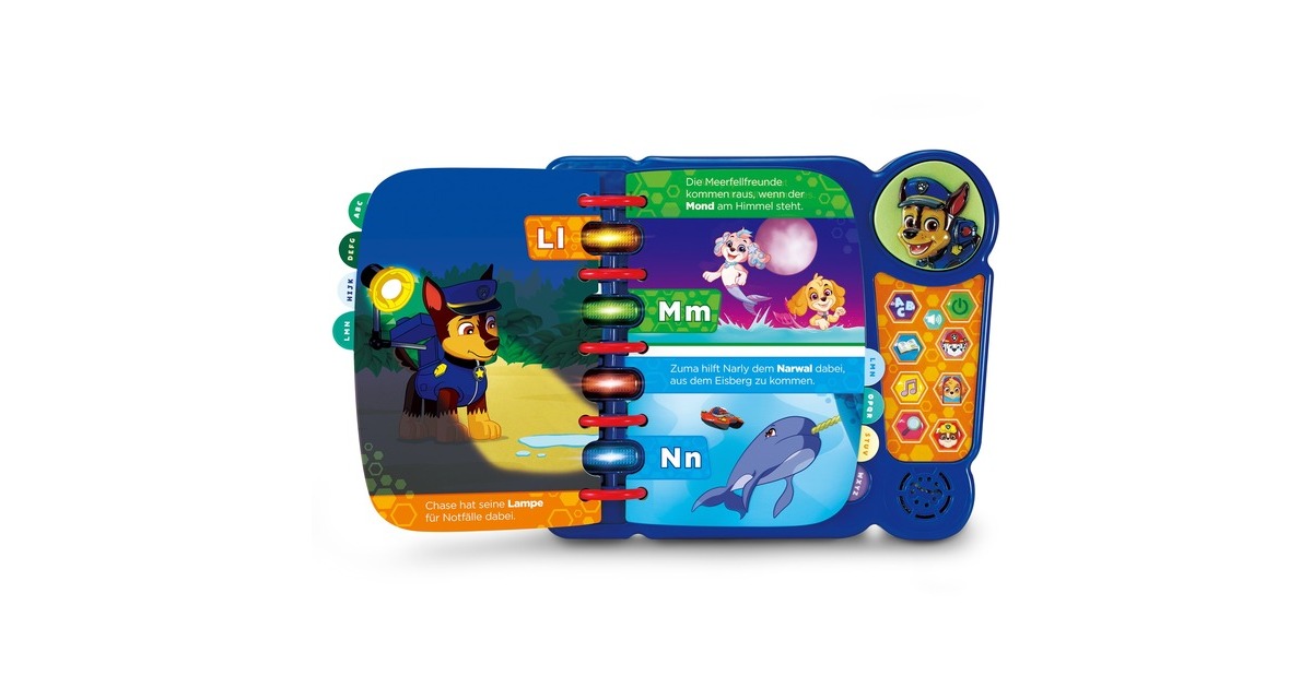Buchstaben und Wörter mit der Paw Patrol lernen - und das mit der Originalstimme von Chase. Auf sieben Doppelseiten finden sich in diesem Abenteuerbuch viele Abbildungen zu den Abenteuern der Paw Patrol und 4 Spieleinstellungen: Sätze über die Abenteuer der Paw Patrol, Buchstaben und Wörter, Geräusche und Musik sowie ein Suchspiel. Dieses Lernspielzeug hat vier leuchtende Tasten, die Sätze und Geräuscheffekte auslösen. Hinzu kommen drei Figuren-Tasten, die kurze Anekdoten auslösen und eine große Chase-Taste, die beim Drücken passende Sätze abspielt.Art.-Nr.: 100004708
