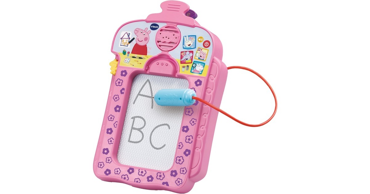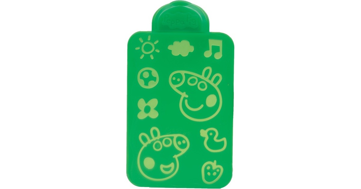 Mit Peppa Wutz zeichnen und ganz nebenbei Buchstaben lernen! Die Maltafel kommt mit einem Zeichenstift, einer praktischen Radierfunktion sowie Schablonen, mit denen Motive aus der Welt von Peppa Wutz und Buchstaben nachgezeichnet werden können. Neben dem Zeichenmodus gibt es dabei noch den Musikmodus, bei dem Musik abgespielt wird, wenn gezeichnet wird. Außerdem gibt es ein Buchstabensuchspiel und ein Spiel um buchstabenbezogene Begriffe. Die Maltafel spricht mit Peppas Originalstimme aus der Serie. Art.-Nr.: 1625989