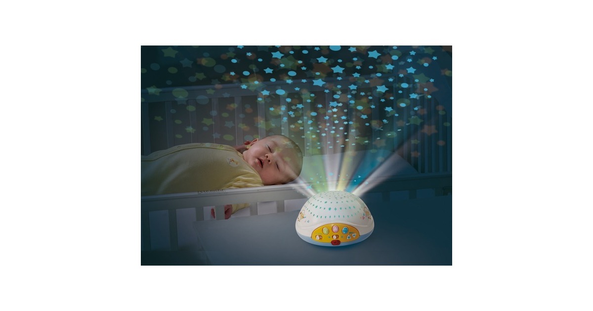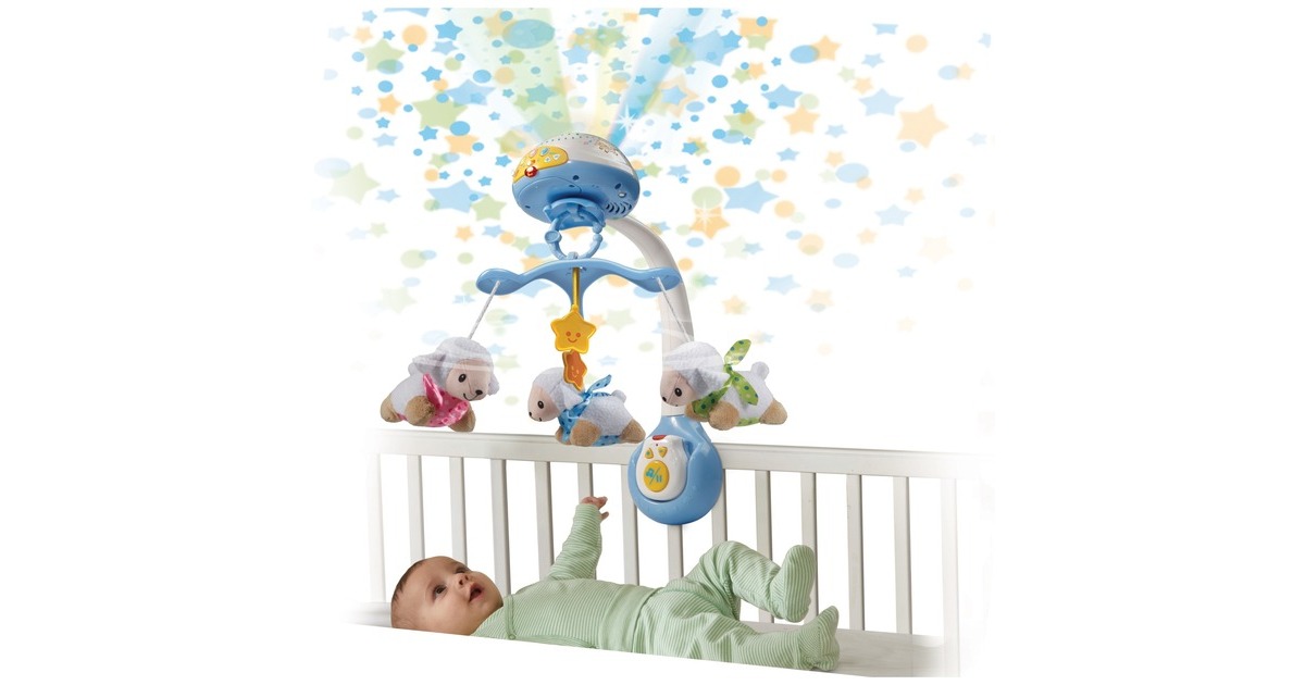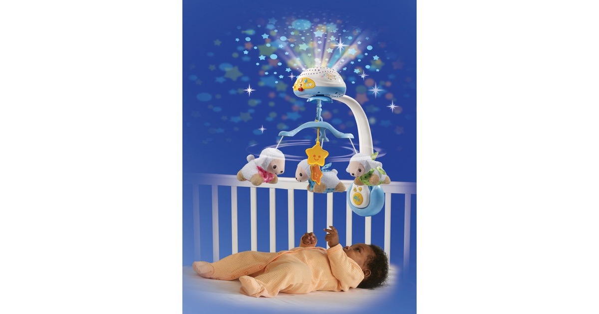 Für besonders süße Träume sorgt das Schäfchen-Mobile! Drei süße, weiche Plüsch-Schäfchen drehen sich im Kreis. Dazu werden Sternenlichter mit bunten Lichteffekten an die Decke projiziert. Vier Schlaflieder und beruhigende Naturgeräusche begleiten Babies sanft in den Schlaf. Der Geräuschsensor lässt die Melodien wieder erklingen, sobald das Baby weint. Durch die Zeitschaltuhr, die auf 15, 30 oder 45 Minuten eingestellt werden kann, und den zwei Lautstärkereglern lässt sich das Schäfchen-Moblie den individuellen Bedürfnissen der Kleinen anpassen. Die Fernbedienung sorgt für Bedienkomfort auch aus der Distanz.