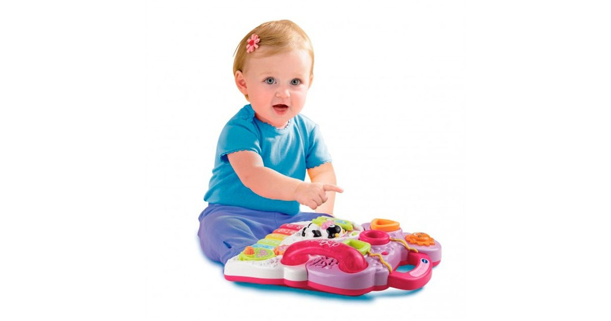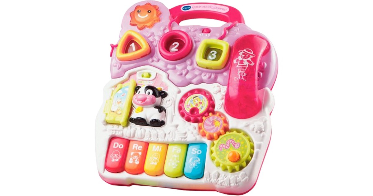 5 bunte Musiktasten, 3 leuchtende Formentasten zum Aufstecken, 3 Zahnräder zum Drehen, 2 bunte Rollen, bewegliche Tür zum Umklappen, Kuhtaste, abnehmbarer Telefonhörer, Bewegungssensor, 1 gesungenes Kinderlied und 11 Kindermelodien (Liedtexte in der Bedienungsanleitung) |