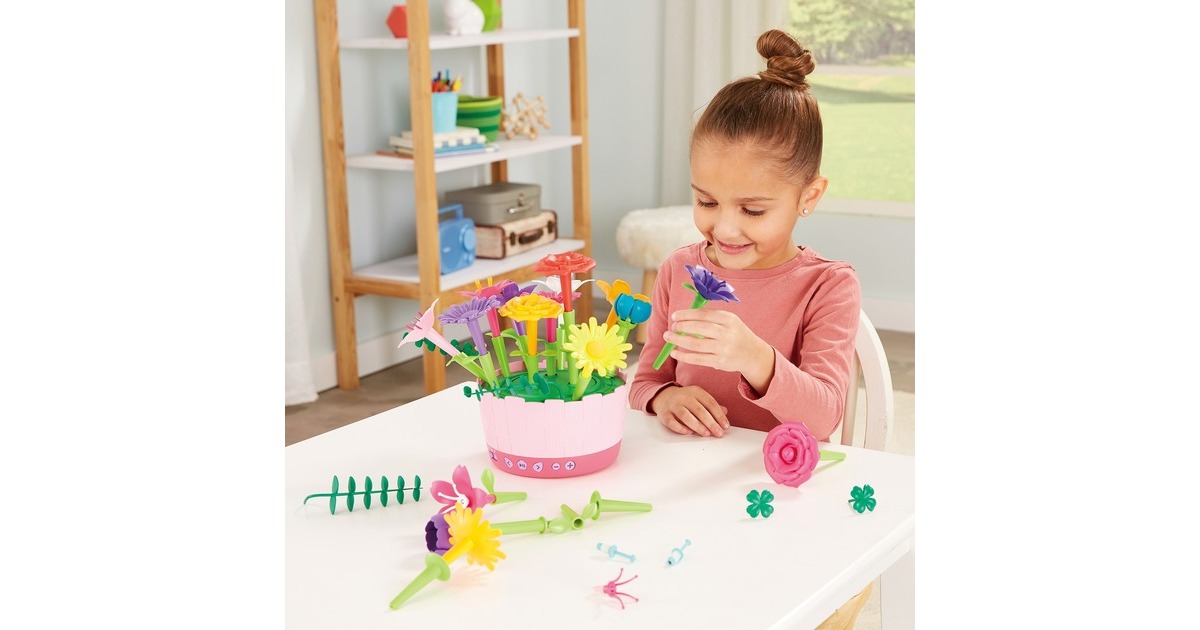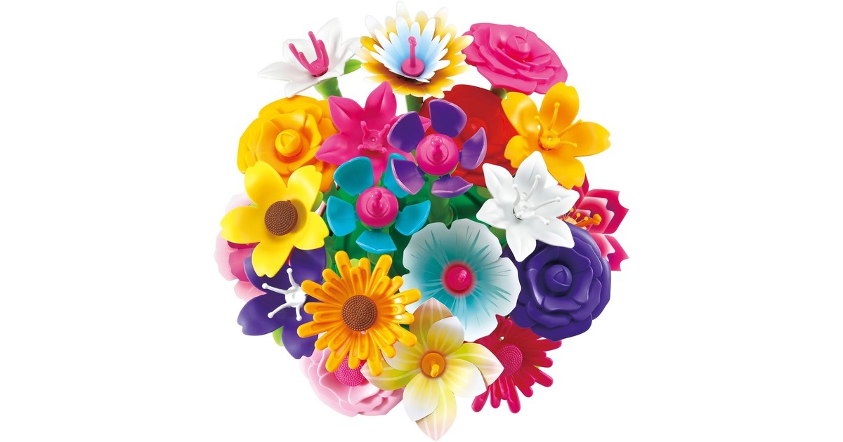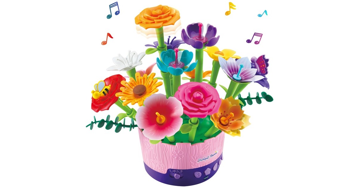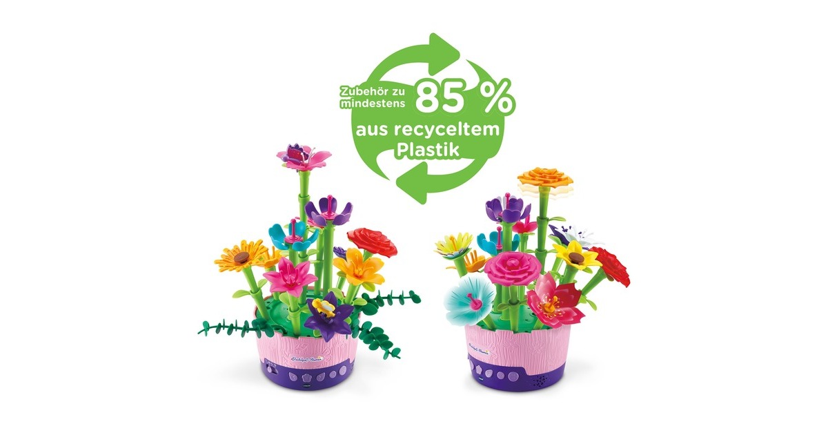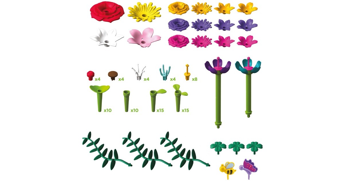 100 bunte Kunststoffteile (Blumen, Stängel, Blätter, Deko, Biene, Schmetterling), 48 Papierblüten, drei Musik-Einstellungen (Natur, beruhigend, Pop), Handbuch |