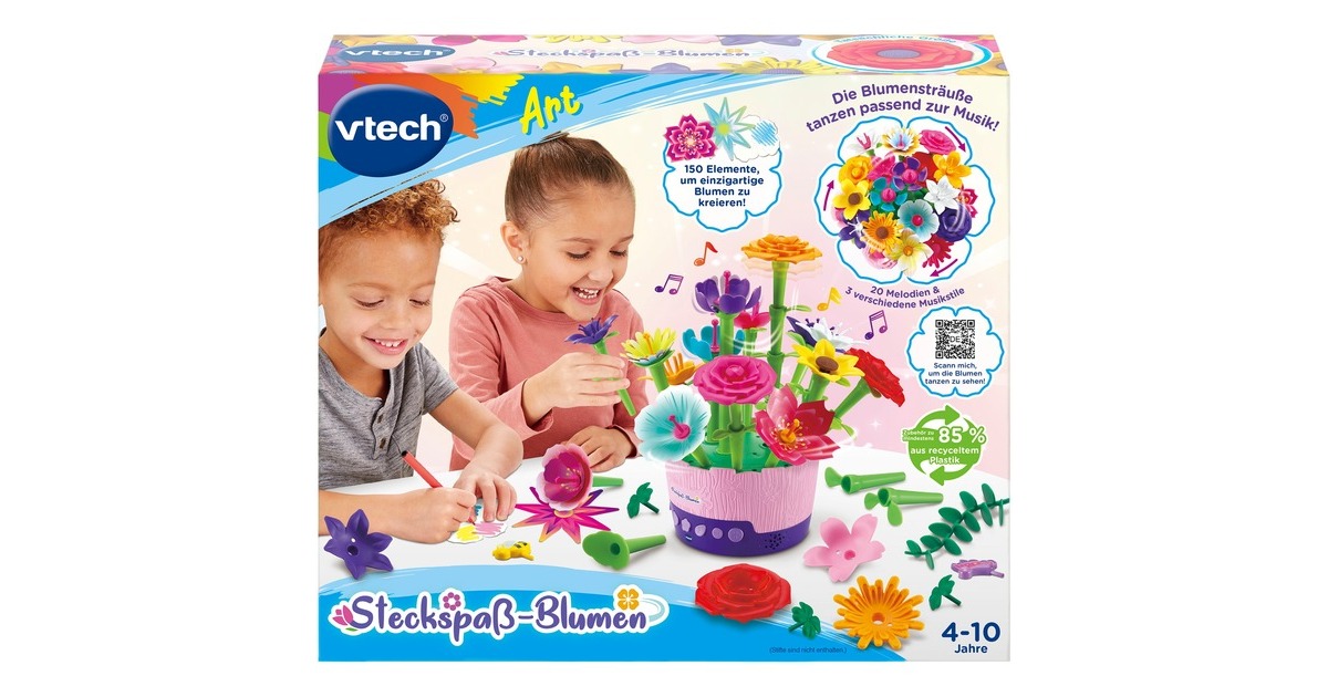 Mit den Steckspaß-Blumen von VTech können Kinder ab 3 Jahren kreativ werden: Dieses Set enthält jede Menge bunte Teile und Papierblüten, mit denen sich ein bunter Strauß ganz nach Belieben gestalten lässt. Doch nicht nur das: Der Blumenstrauß bewegt sich im Topf, wobei Musik in drei verschiedenen Einstellungen abgespielt werden kann - passend zur eigenen Stimmung. Das Handbuch liefert viele Anregungen - Kinder können ihrer Kreativität mit diesem Set freien Lauf lassen.Art.-Nr.: 100004726
