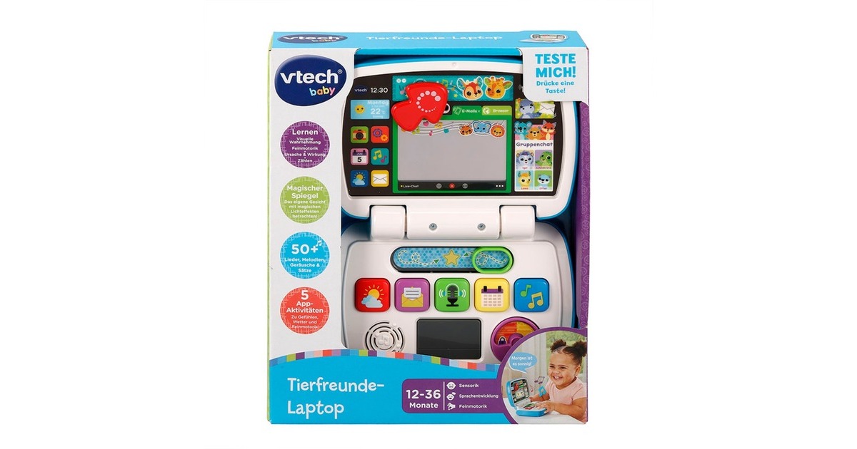 Erster Computerspaß mit dem Tierfreunde-Laptop! Egal ob Tierfreunde kennenlernen, Zählen oder Wettervorhersagen - das liebevoll gestaltete Spielzeug steht für Lernspaß und fördert dank tollem Schieber und bunten Tasten die Feinmotorik. Der integrierte Spiegel zaubert außerdem magische Effekte und zeigt das eigene Gesicht mit lustigen Animationen. Art.-Nr.: 1895994