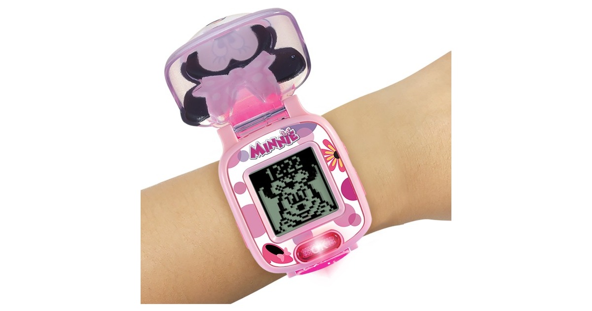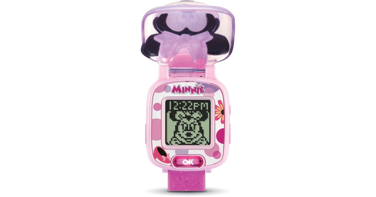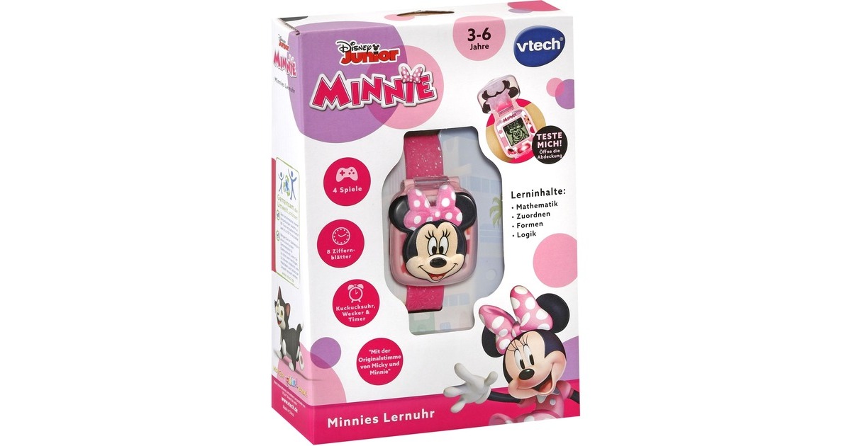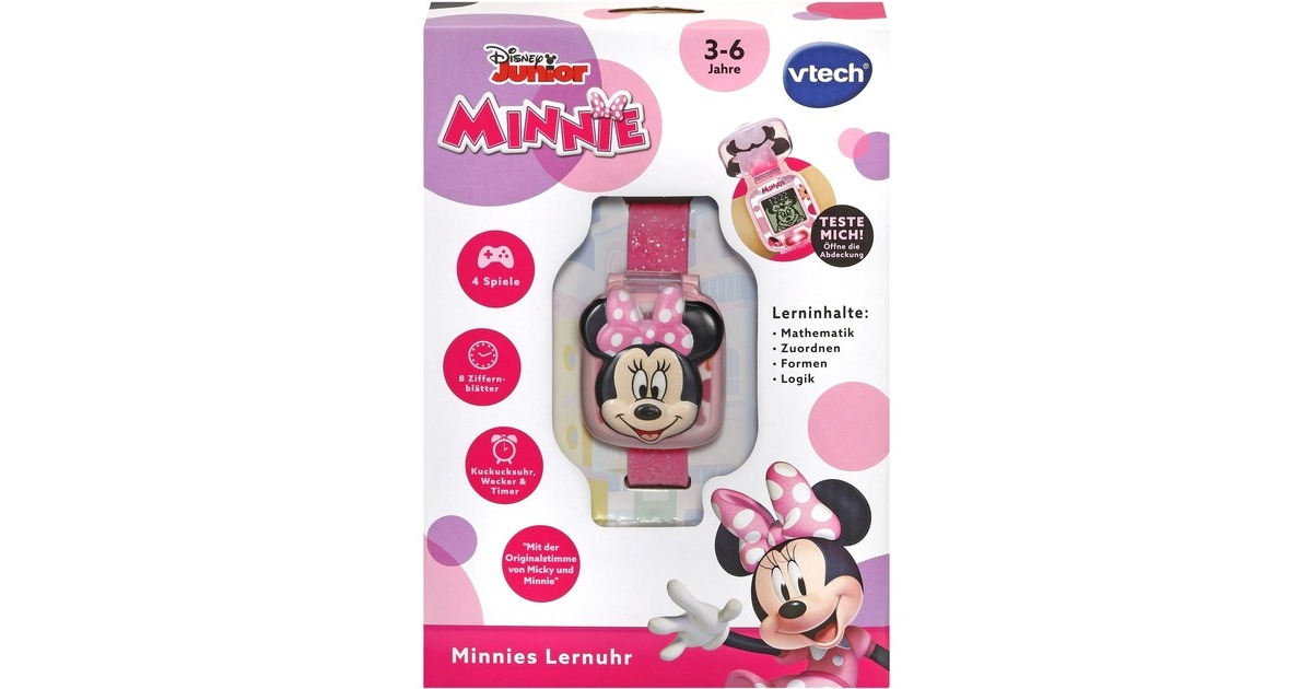 Minnies Lernuhr bietet vier spannende Lernspiele, eine Auswahl an verschiedenen Ziffernblättern, eine Weckfunktion, einen Timer und eine Stoppuhr. Bei geschlossenem Deckel und Drücken der OK-Taste ertönt ein Spruch von Minnie Maus. Die Lernspiele drehen sich um die Themen Zahlen Reaktionsvermögen, Formen, einfache Gleichungen und Vergleich von Figuren. Lustige Animationen und Soundeffekte sowie das 3D-Cover mit dem Gesicht von Minnie Maus machen diese Uhr zu einem tollen Begleiter für kleine Disney-Fans.Art.-Nr.: 1847121