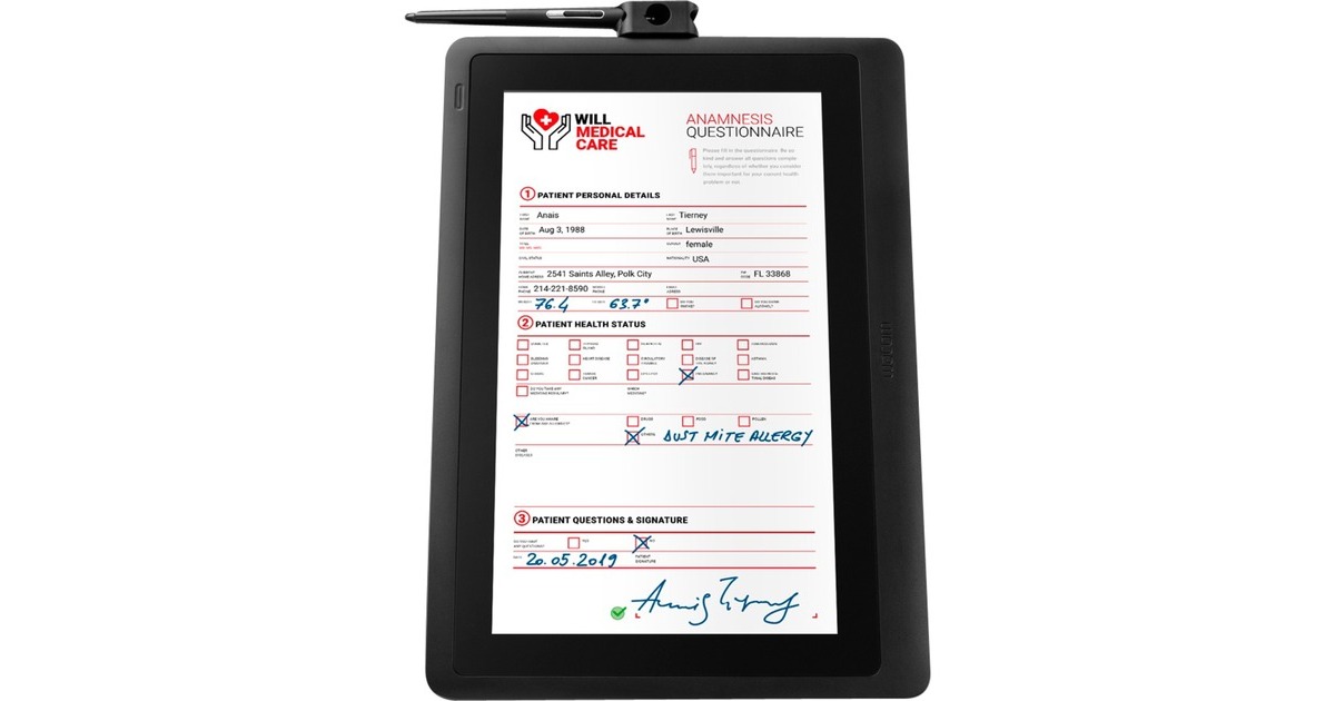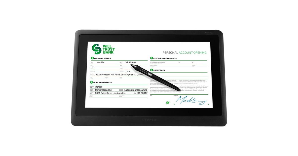Das Wacom DTK-1660E ist mit seinem 15,6 Zoll großen IPS-LCD-Display mit Full-HD-Auflösung ein Premium-Stift-Display, mit dem Unternehmen optimale papierlose Abläufe für persönliche Kundeninteraktionen realisieren können. Das DTK-1660E bietet modernste Verschlüsselung und einen digitalen Stift mit 8.192 Druckstufen für die biometrisch genaue Erfassung von elektronischen Unterschriften. Es kann im Hoch- oder Querformat genutzt werden und bietet eine Vollbilddarstellung von Dokumenten im A4- und Letter-Format ohne Verkleinern/Scrollen der Anzeige. Zudem lässt sich das DTK-1660E intuitiv bedienen und dank des 3-in-1-Anschlusskabels einfach und übersichtlich installieren.Art.-Nr.: 1565703