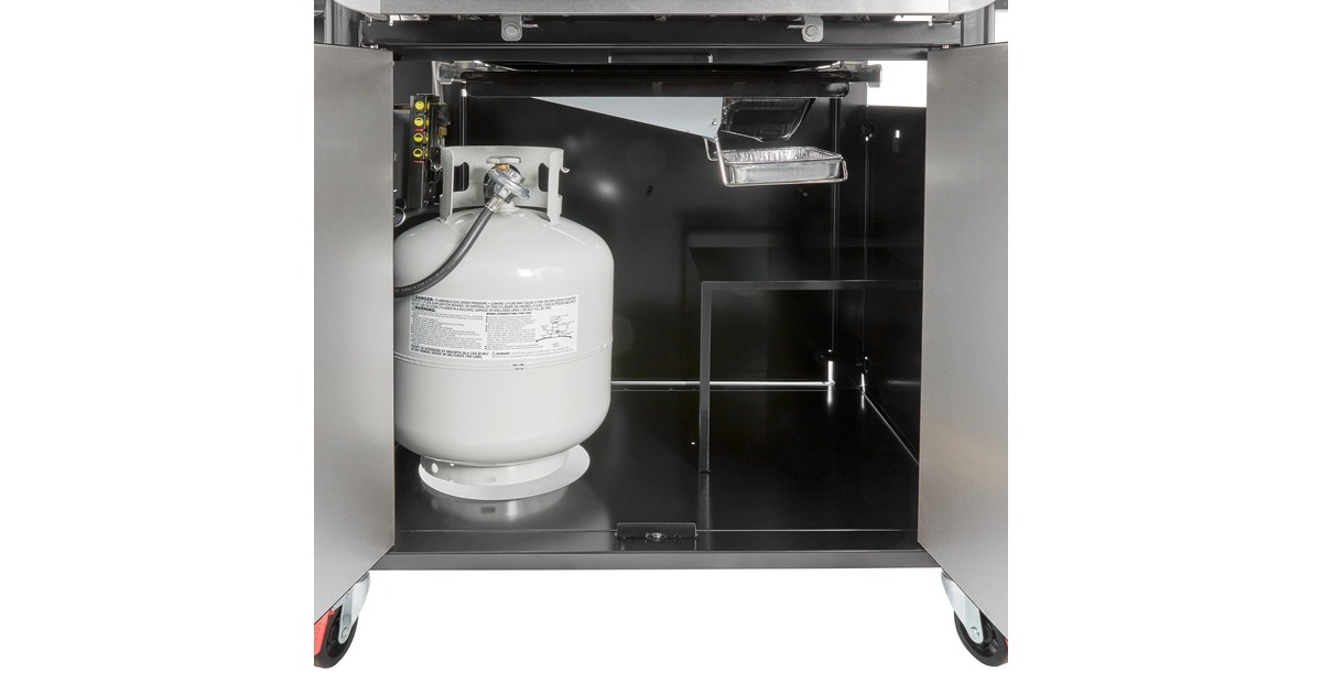 Lackierte Stahltüren, Grillrosthaken an der Seite, Gasflaschenwanne |
