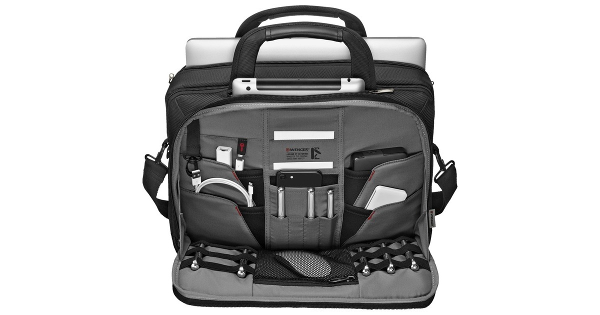 Frontfach, Utensilienfach, RFID Schutzfach, SmartOrg-Organizer sorgt dafür, dass Gegenstände wie Kabel, Ladegeräte und Visitenkarten übersichtlich und leicht zugänglich sind, gepolstertes 10" Tablet-Fach |