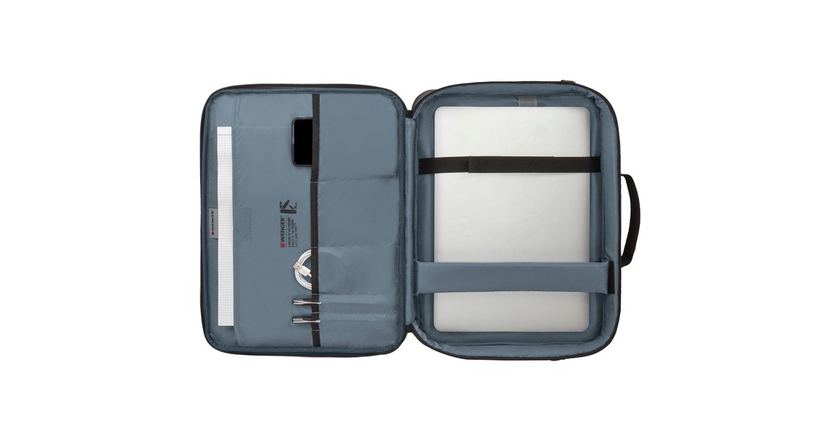 Die Wenger BQ 16'' eine Notebooktasche mit unzähligen Organisationsfunktionen. Äußerlich zurückhaltend, aber im Inneren durchdacht und systematisch, ist die BQ 16'' Notebooktasche ein hart arbeitendes mobiles Büro. Der Organizer für das Wesentliche sorgt für Ordnung bei Stromkabeln, Ladegeräten und Visitenkarten. Eine durchdachte Schlupftasche sichert Papiere, und der durchgehende Trolley-Gurt lässt sich für einfachen Transport über die Griffe von Rollkoffern schieben.Art.-Nr.: 1787068
