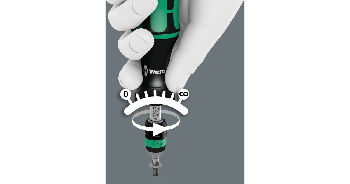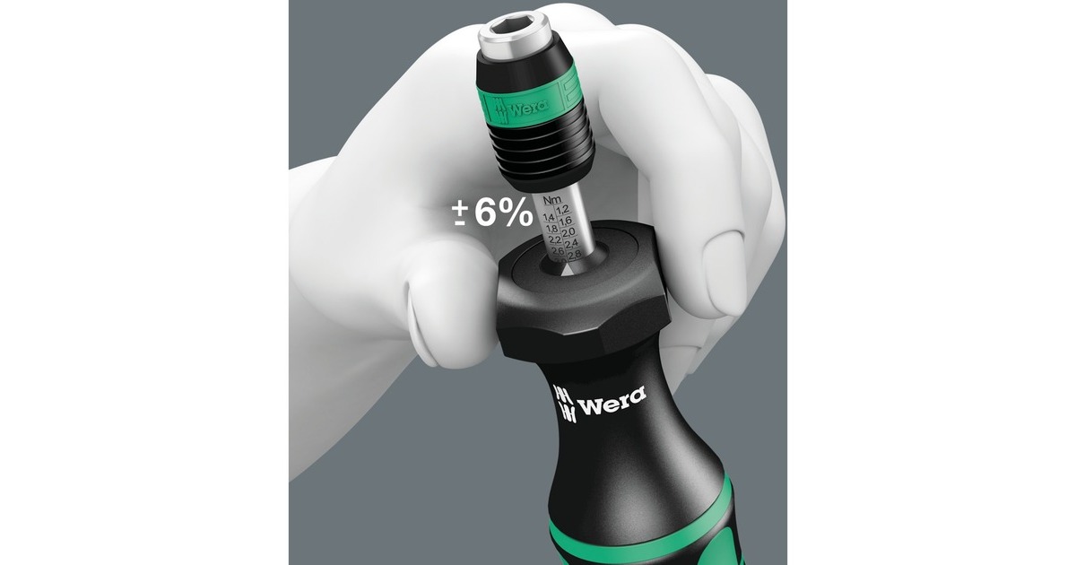 Die einstellbaren Drehmoment-Schraubendreher von Wera erlauben variable Drehmomenteinstellung bei höchster Genauigkeit. Der Anwender erhält beste Verarbeitungsqualität mit überlegener Ergonomie im bekannten Wera Design. Der Drehmoment-Schraubendreher 7441 mit Rapidaptor Schnellwechselfutter (rapid-in, rapid-out, rapid-spin, chuck-all und single-hand-Funktion) hat ein einstellbares Drehmoment von 1,2 bis 3Nm. Er eignet sich für Bits mit 1/4"-Außensechskantantrieb. Beim Erreichen des eingestellten Drehmoments ist ein deutlich hör- und spürbares Überrasten mit Klicksignal wahrnehmbar. Zum Lösen festsitzender Schrauben steht unbegrenztes Lösemoment zur Verfügung. Der mehrkomponentige Kraftform-Griff mit Abrollschutz ermöglicht dabei schnelles und schonendes Arbeiten mit dem Drehmoment-Schraubendreher 7441.Art.-Nr.: 1269469