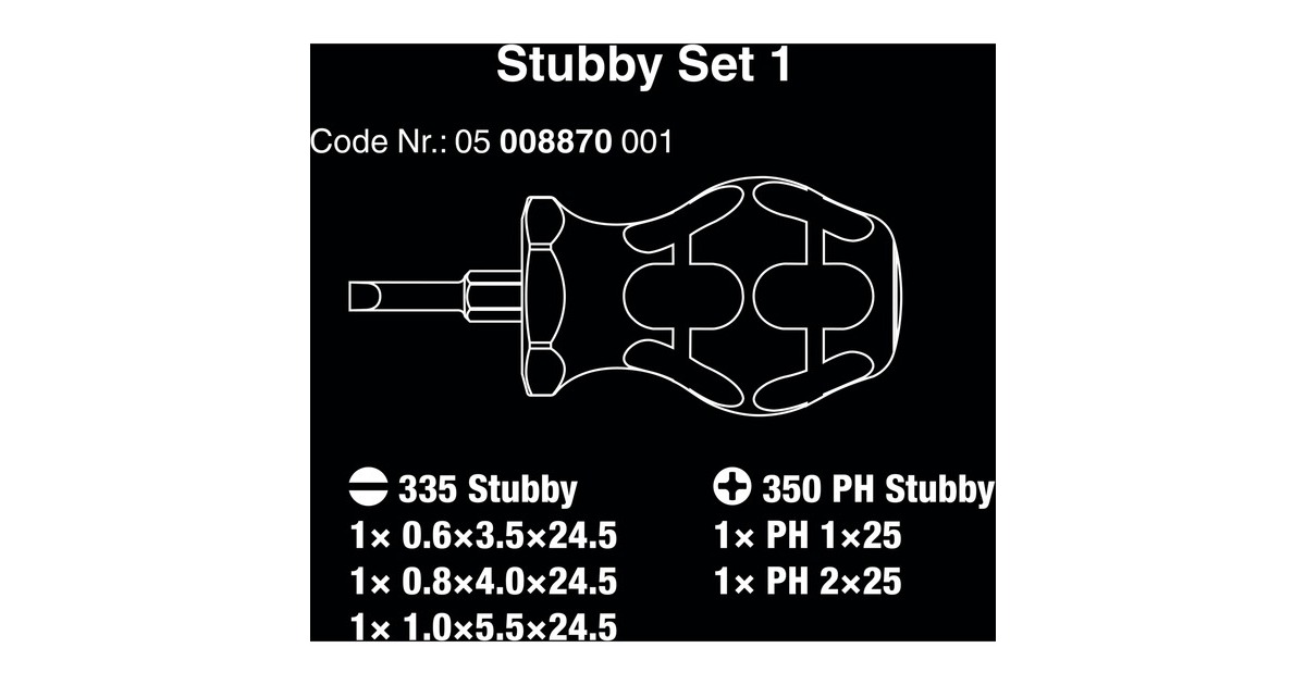 Das Stubby Set 1 von Wera enthält zwei Kreuzschlitz- und drei Schlitz-Vergaserschraubendreher. Das sind besonders kleine kompakte Schraubendreher mit kurzer Klinge für schwer zugängliche Bereiche, sogenannte Stubbys. Der 2-komponentige Kraftform Griff mit seiner praktischen Kombination aus harten und weichen Zonen ermöglicht festes Zupacken und präzises Arbeiten. Die Klinge weist alle Vorzüge der Wera Bit-Technologie auf, eine spezielle Oberflächenvergütung der Klingen für hohen Korrosionsschutz und eine optimale Passgenauigkeit in der Schraube. Der Sechskant-Abrollschutz verhindert lästiges Wegrollen auf schrägen Flächen.Art.-Nr.: 1683901