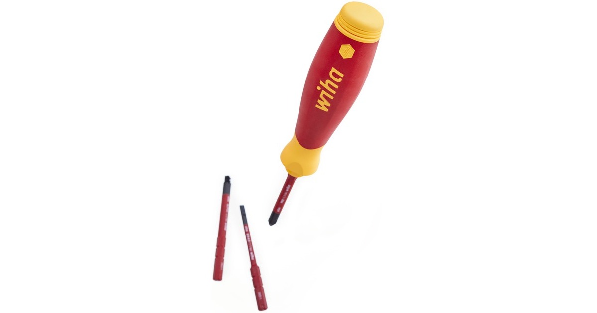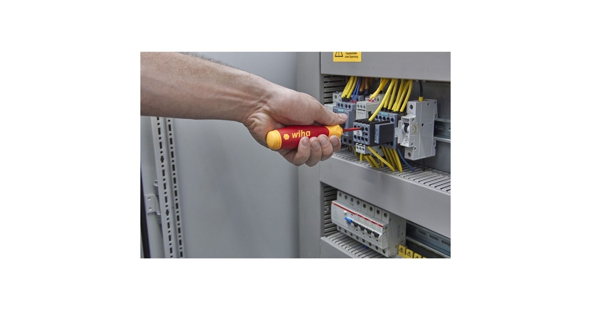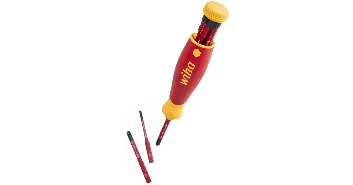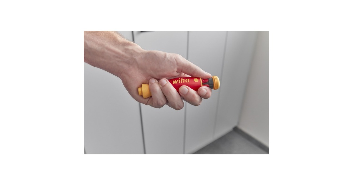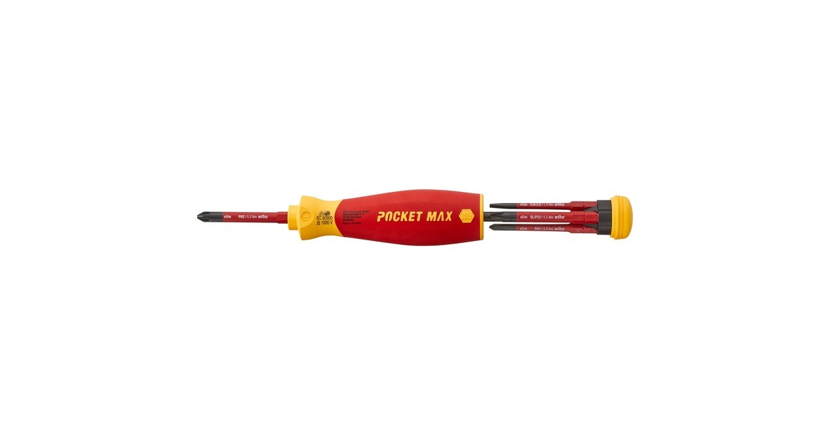 Der Schraubendreher-Bithalter mit Bitmagazin PocketMax electric von Wiha ist die kompakte Alternative zum Schraubendrehersatz. Der kompakte und leichte Schraubendreher PocketMax passt problemlos in jede Hemd- und Hosentasche und ist der ideale Begleiter für jeden Elektriker im mobilen Einsatz. Er ist mit einem integrierten Bitmagazin im Griff ausgestattet, welches vier 75mm lange SlimBits beinhaltet. Dank einer magnetischen Schließfunktion kann das Bitmagazin spielend leicht geöffnet werden, um die Bits zu entnehmen, und beim Verschließen gleitet es zielstrebig und leicht in den Schaft zurück. Die magnetische Bitaufnahme sorgt für einen unkomplizierten und schnellen Bitwechsel und die drehbare Kappe für eine komfortable Handhabung. Auch in Puncto Sicherheit überzeugt der PocketMax electric, da sowohl der Magazin-Bithalter als auch die enthaltenen slimBits nach der internationalen Norm IEC 60900 zertifiziert sind. Die schlanken, 75mm langen slimBits ermöglichen durch die im vorderen Bereich vollständig in den Bit integrierte Schutzisolation einen perfekten Zugriff auf tiefliegende Schraub- oder Federklemmen.Art.-Nr.: 1837528