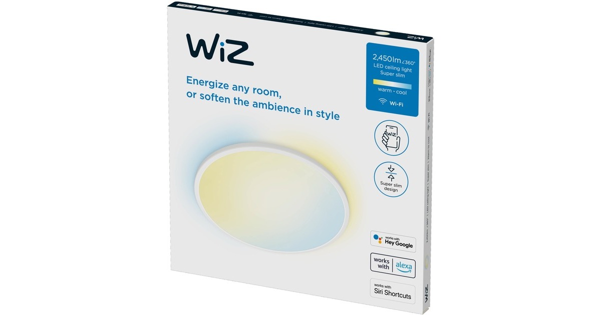 Der Superslim Deckenleuchte 22W von WiZ ist eine schlanke Leuchte mit einer Lichtleistung von bis zu 2450 Lumen. Sie erzeugt ein weißes dimmbares Licht, dessen Farbtemperatur sich von warmweiß bis kaltweiß steuern lässt. Die Steuerung erfolgt über die WiZ-App, wobei nur eine Verbindung zum WLAN und kein zusätzlicher Gateway notwendig ist. Dabei lassen sich eigene Routinen erstellen und benutzerdefinierte Szenen einstellen. Darüber hinaus ist diese Leuchte kompatibel mit verschiedenen Sprachassistenzsystemen.Art.-Nr.: 1855730