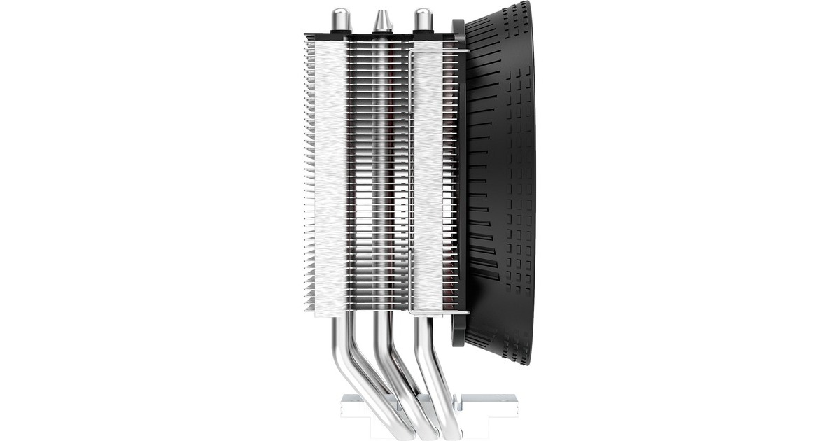 leiser, flüssigkeitsgelagerter 120-mm PWM Trichter-Lüfter, drei 6 mm Kupferheatpipes für maximale Wärmeabfuhr, Lamellendesign sorgt für effiziente Kühlung der CPU und allen umliegenden Bauteilen, durch leichten Überstand des Lüfters an Ober- und Unterseite werden Hotspots vermieden, Montage des Lüfters an beiden Seiten des Kühlkörpers möglich |