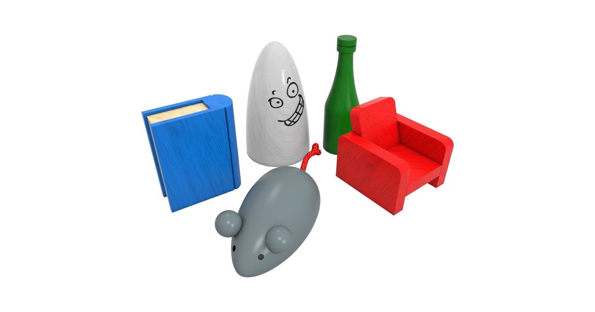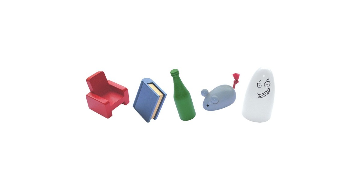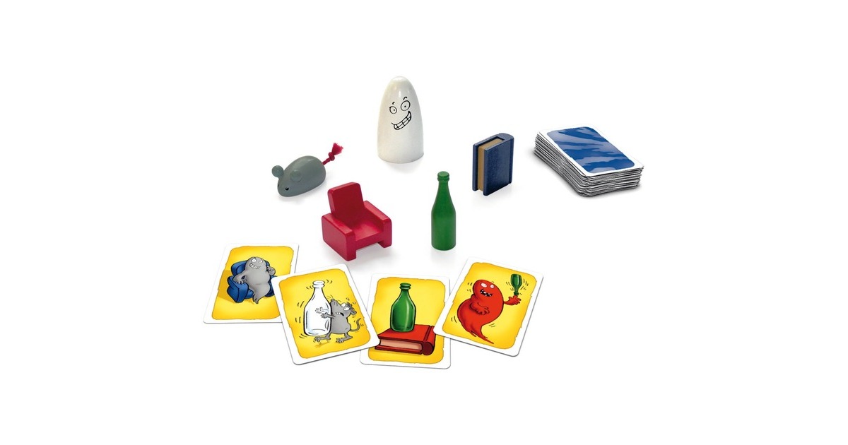 5 Figuren (Geist, Sessel, Flasche, Buch, Maus), 60 Karten, 1 Spielanleitung |
