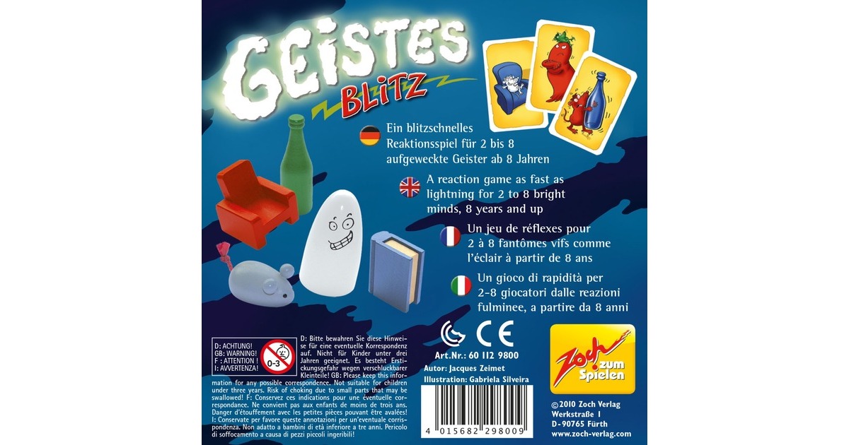 Geistesblitz von Zoch ist ein geistreiches Reaktionsspiel, bei dem schnelle Auffassungsgabe und richtige Reaktion entscheidend sind. In der Tischmitte stehen fünf große Holzfiguren in fünf Farben. In jeder Runde wird eine Karte aufgedeckt, auf der zwei Figuren in zwei unterschiedlichen Farben zu sehen sind. Nun müssen die Spieler blitzschnell erkennen, welche Figur gesucht wird. Sind beide Figuren nicht in ihrer Originalfarbe abgebildet, so muss die Figur geschnappt werden, die weder in Farbe noch Form auf der Karte zu sehen ist. Ist aber eine Figur in ihrer Originalfarbe zu sehen, so muss diese geschnappt werden. Wer richtig liegt, gewinnt die Karte, wer falsch liegt, verliert eine bereits gesammelte. Wer am Ende die meisten Karten besitzt, gewinnt.Art.-Nr.: 1195361