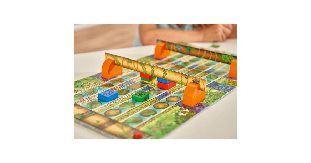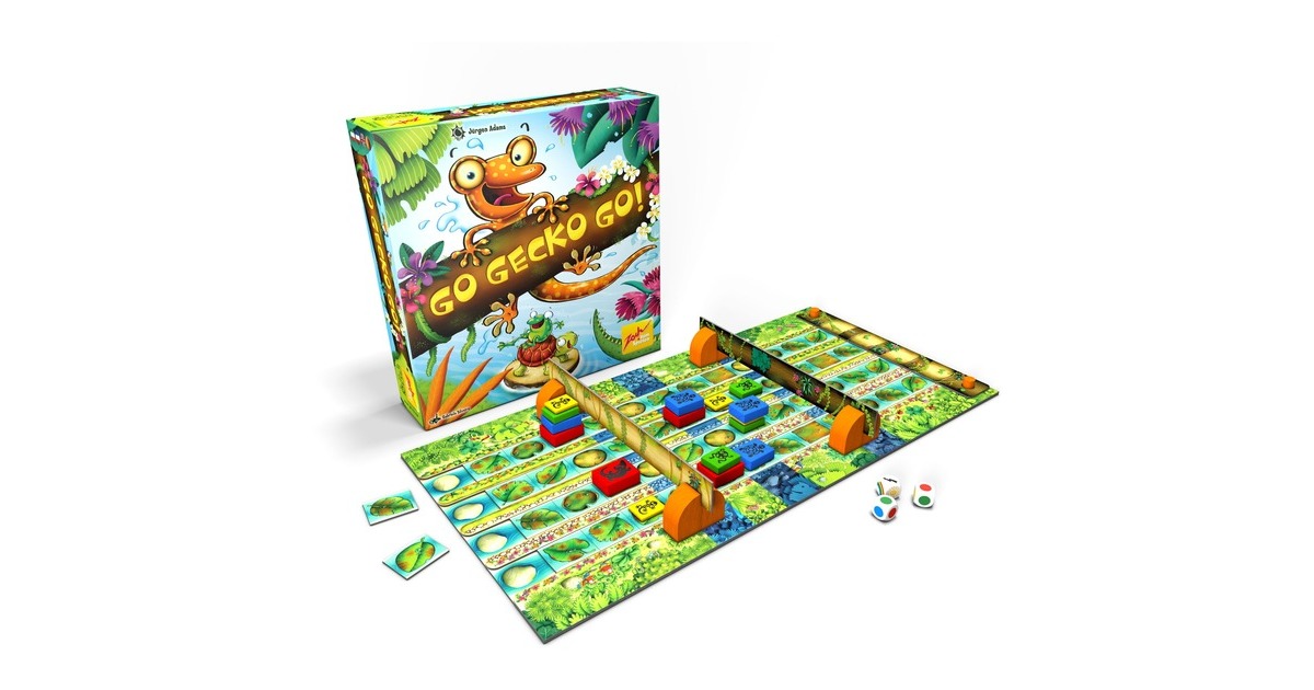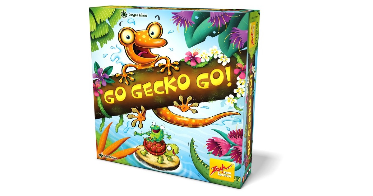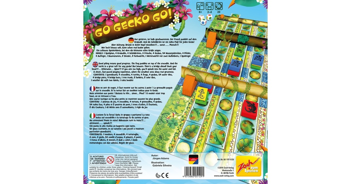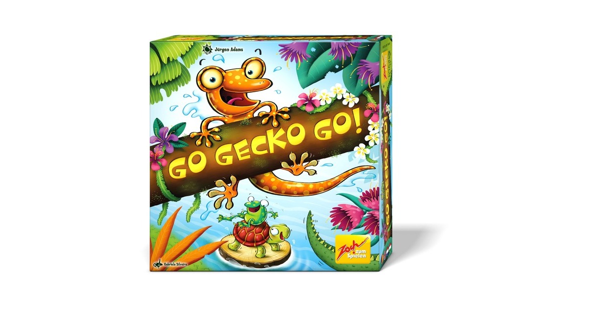Wasser marsch zum großen Wettschwimmen! Drunter und drüber geht es, wenn sich große und kleine Tiere auf allerlei Treibgut in der Strömung tummeln. Jede Schwimmriege besteht aus einem großen Krokodil, einer Schildkröte, einem Frosch und einem kleinen Gecko. Winzlinge können sich auf dem Rücken der kräftigeren Tiere mitnehmen lassen. Aber nur wer beiden Brücken unterwegs mit eingezogenem Kopf ausweicht, geht dabei nicht baden. Bademeister wird, wer seine vier Tiere als Erster bis zum Baumstamm gebracht hat. Go Gecko Go ist ein Kinderspiel, das mit viel Spaß ein gutes Gespür für Höhenunterschiede vermittelt.Art.-Nr.: 1558333