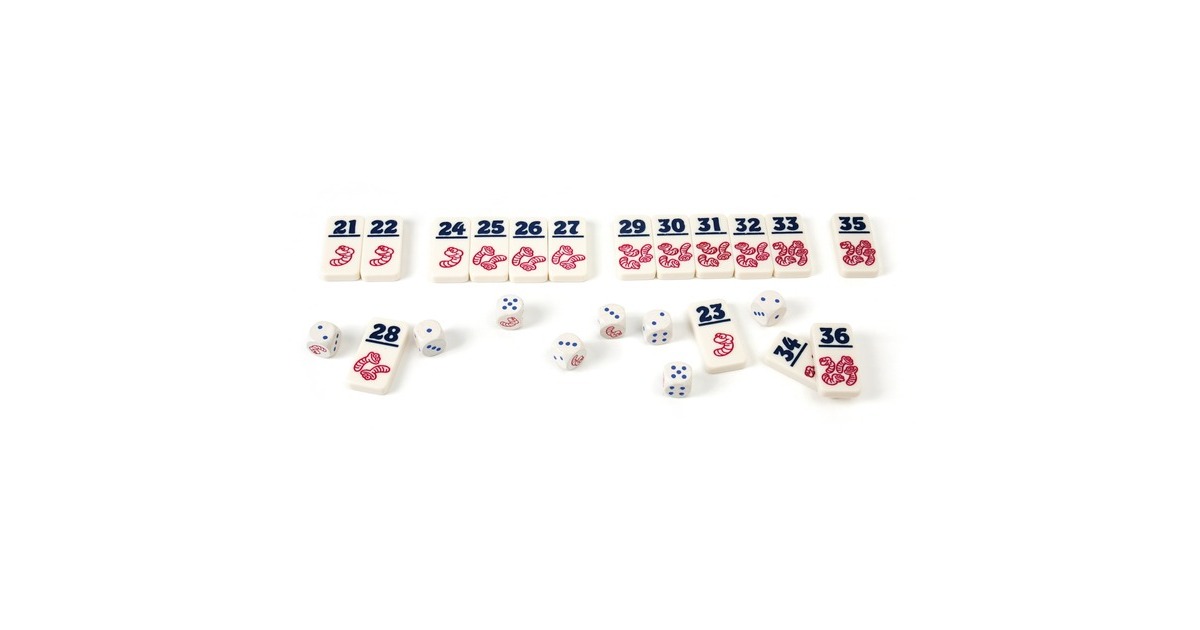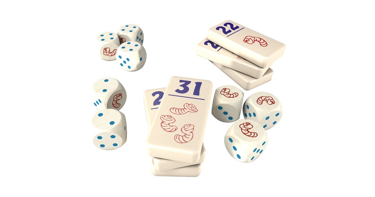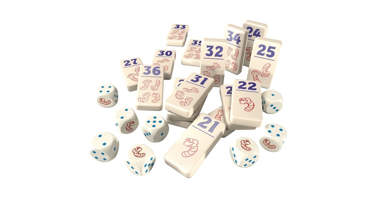 16 Bratwurmportionen mit den Werten 21-36,8 Würfel mit je 6 Symbolen (einem Wurm und den Zahlen 1-5), 1 Spielanleitung |
