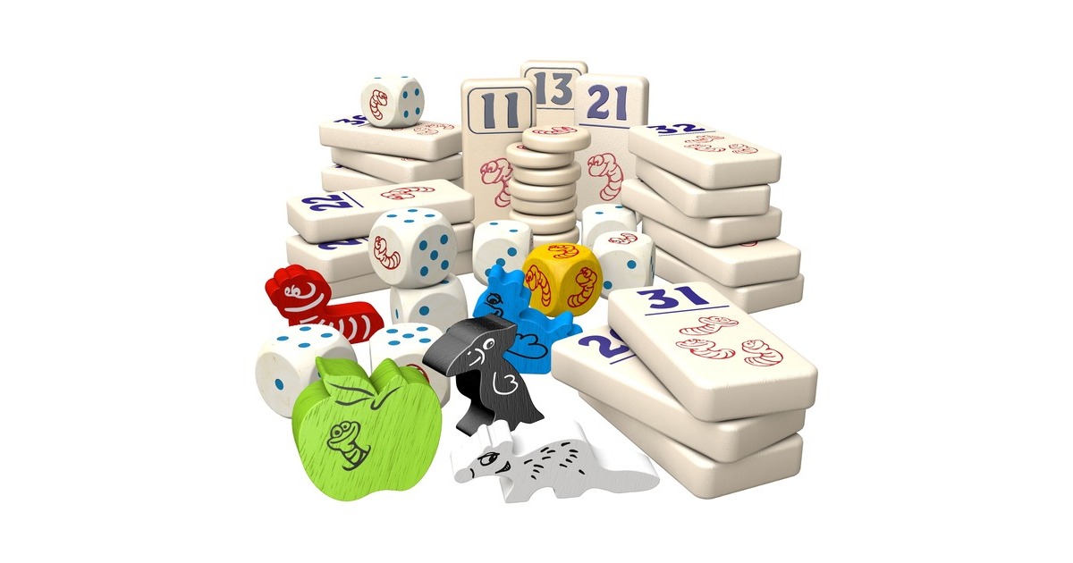 8 Würfel, 1 Sonderwürfel, 1 Huhn, 1 Wurm, 1 Wiesel, 1 Rabe, 1 Apfel, 7 Rostbratwürmer, 1 Anleitung |