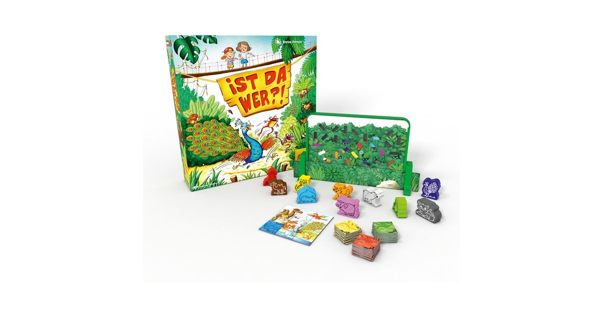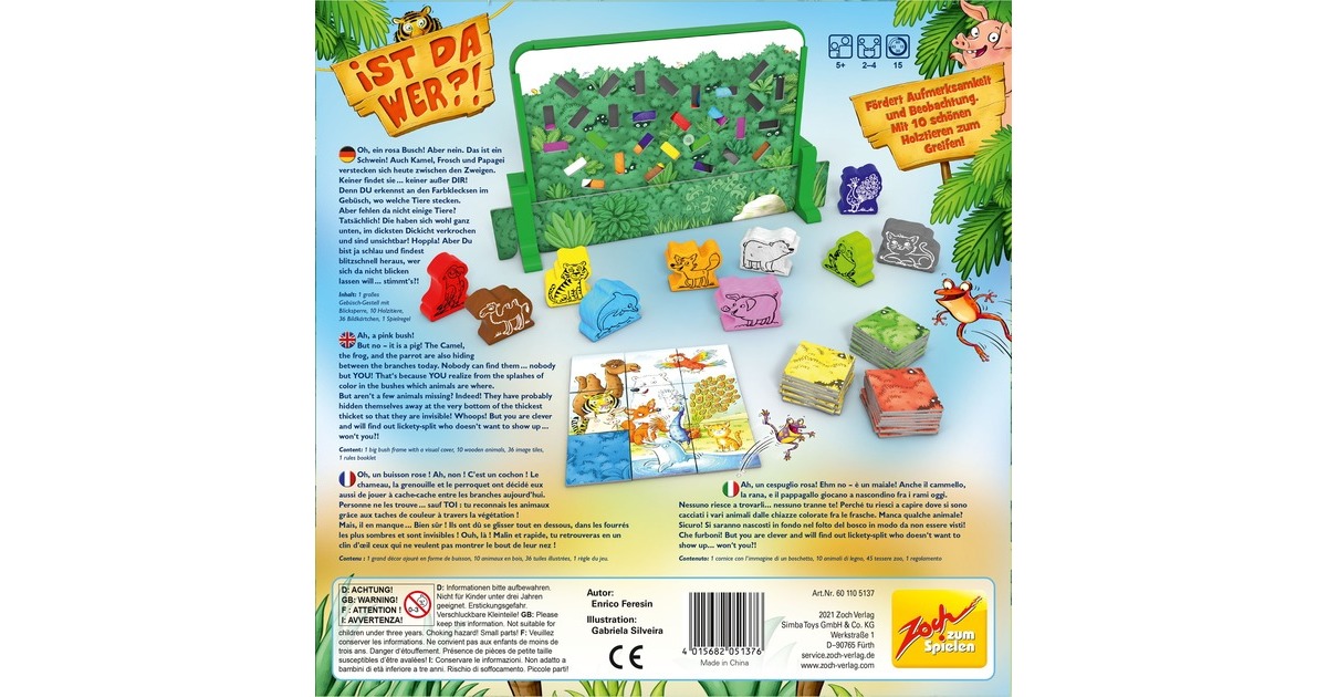 Zehn Tierpaare haben sich in einem großen dreidimensionalen Gebüsch versteckt. Von ihnen sind aber nur einige Farbkleckse durch die Sichtschlitze zwischen den Zweigen zu sehen. Seht genau hin und findet heraus, welche Farben nicht da sind und erkennt so, welche Tiere sich hinter dem Dickicht ganz unten am Busch unsichtbar gemacht haben. In dieses Versteck ziehen sich in jeder Spielrunde neue Tiere zurück. Wer herausgefunden hat, welche Tiere sich gerade im Dickicht verborgen haben, schnappt sich ganz schnell deren Holzfigur! Als Belohnung bekommt jeder der richtig liegt Bildkärtchen, aus denen er seinen eigenen kleinen Zoo zusammenpuzzeln darf. „Ist da wer?!" von Zoch ist das lustig bunte Tier-Such-Spiel rund um sichtbare und unsichtbare Farben für 2-4 Spieler ab 5 Jahren. Es fördert Beobachtung, Kombinationsgabe und Aufmerksamkeit von Kindern. Ausgedacht hat es sich Autor Enrico Feresin. Illustriert wurde es von Gabriela Silveira.Art.-Nr.: 1825826