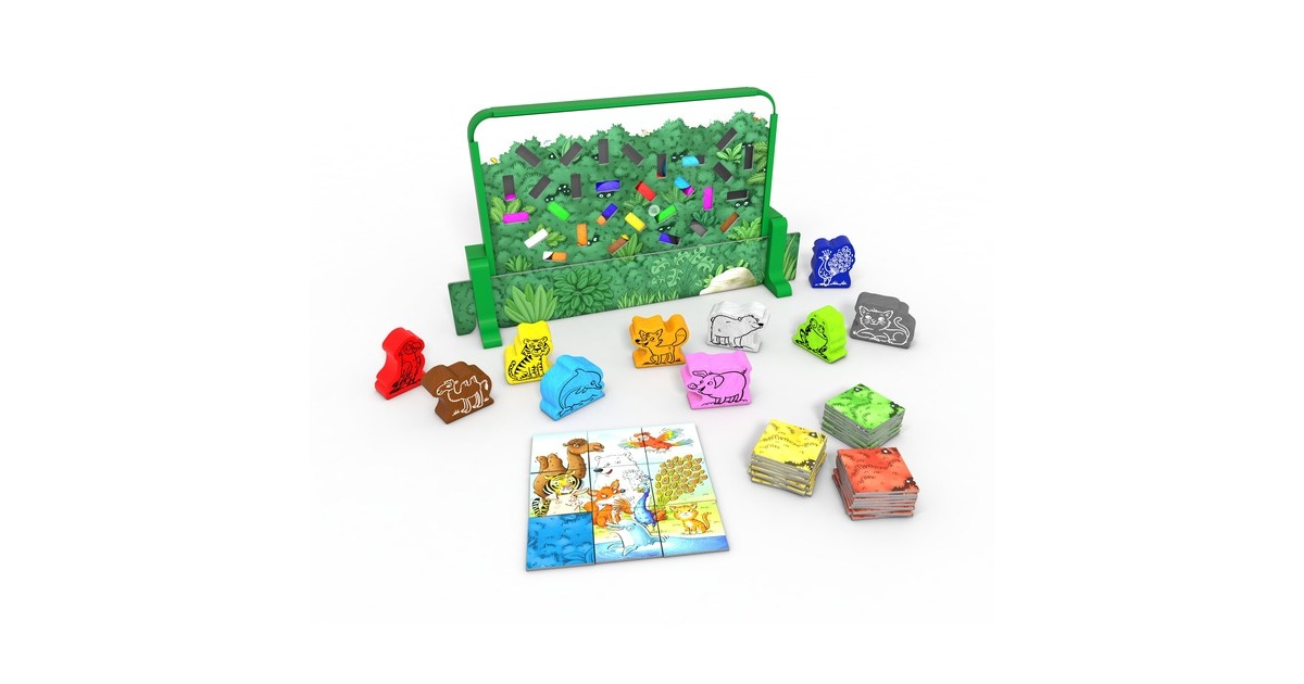 1 Gebüsch-Gestell, gefüllt mit 20 Farbscheiben, 1 Blicksperre („Dickicht“), 10 Holztiere, 36 Bildkärtchen, Anleitung: DE + EN + FR + IT |